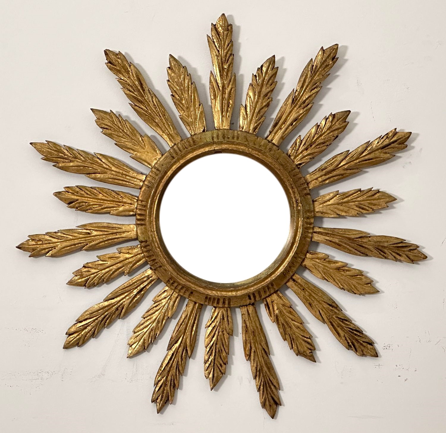 A lovely French gilt sunburst (or starburst) mirror with beautifully gilded wooden rays arranged around the mirror plate glass center.