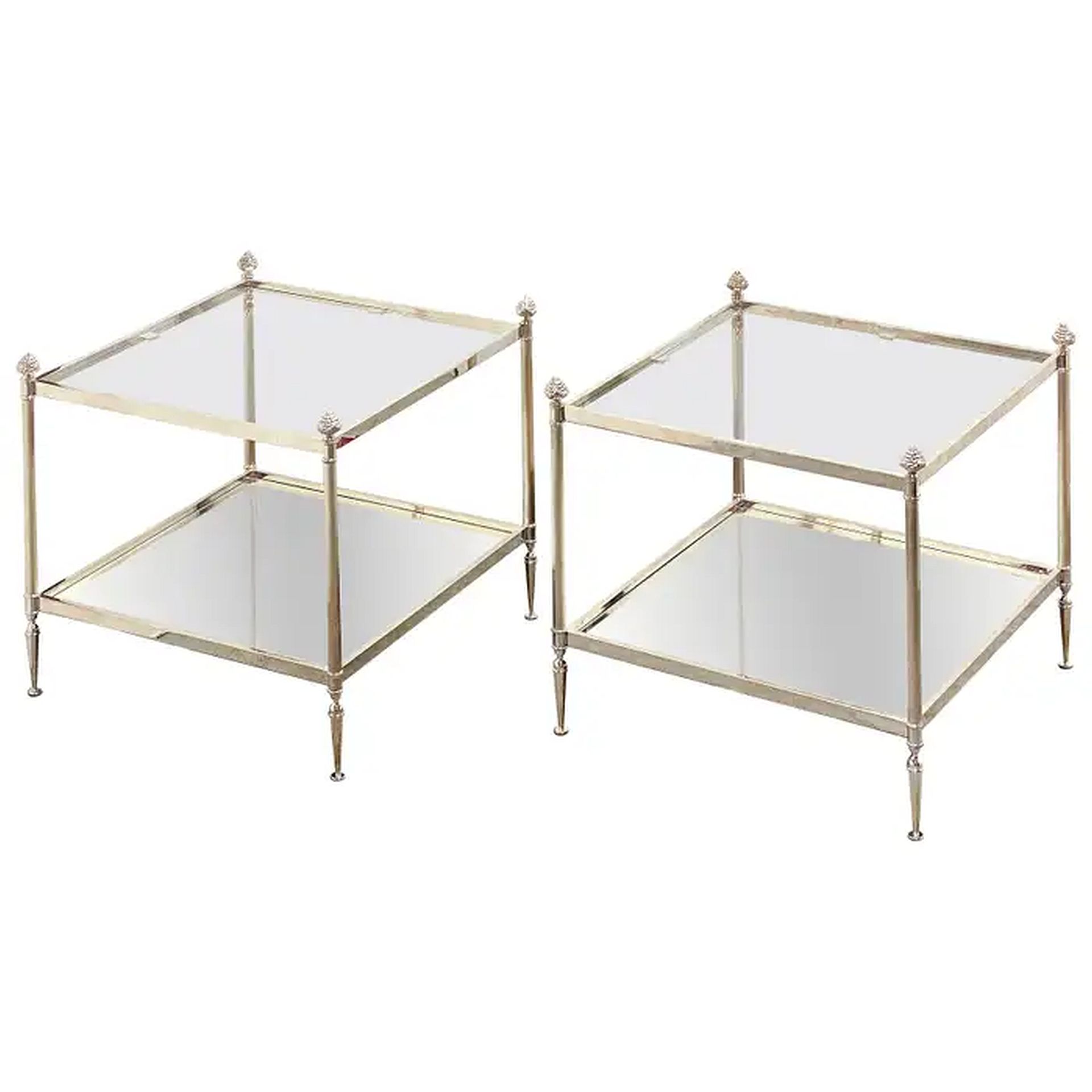 A pair of elegant French two-tiered low side or end tables in the Mid-Century Modern style - each table featuring one square glass panel top inset upon a silvered metal frame over a bottom tier with an inset mirrored glass panel - accented with decorative finials and reeded, tapering legs.