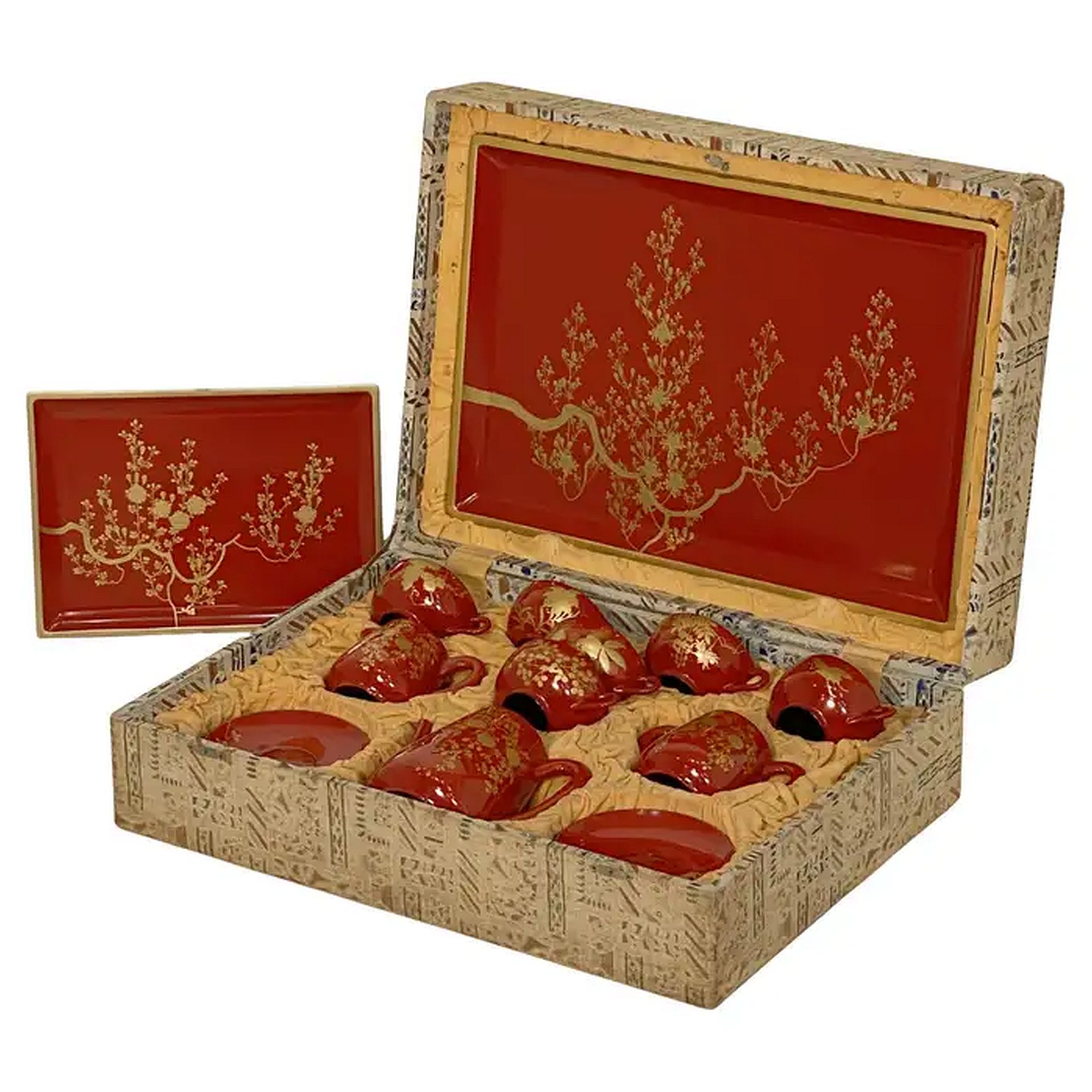 A handsome lacquered tea set from Japan, circa 1920s, featuring a traditional Japanese lacquerware style, known as Urushi, with a deep red color and hand-painted gold designs, prized for its durability and beautiful, transparent glaze.