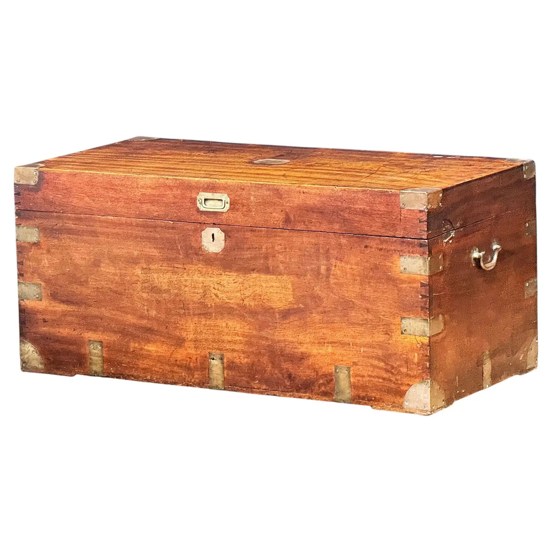 A handsome large British Campaign-era military or naval officer's rectangular trunk or chest (coffer) of brass-bound camphor wood, manufactured for an officer to carry his kit on campaign - with original recessed brass front latch, escutcheon, corners, and carrying handles to each side.