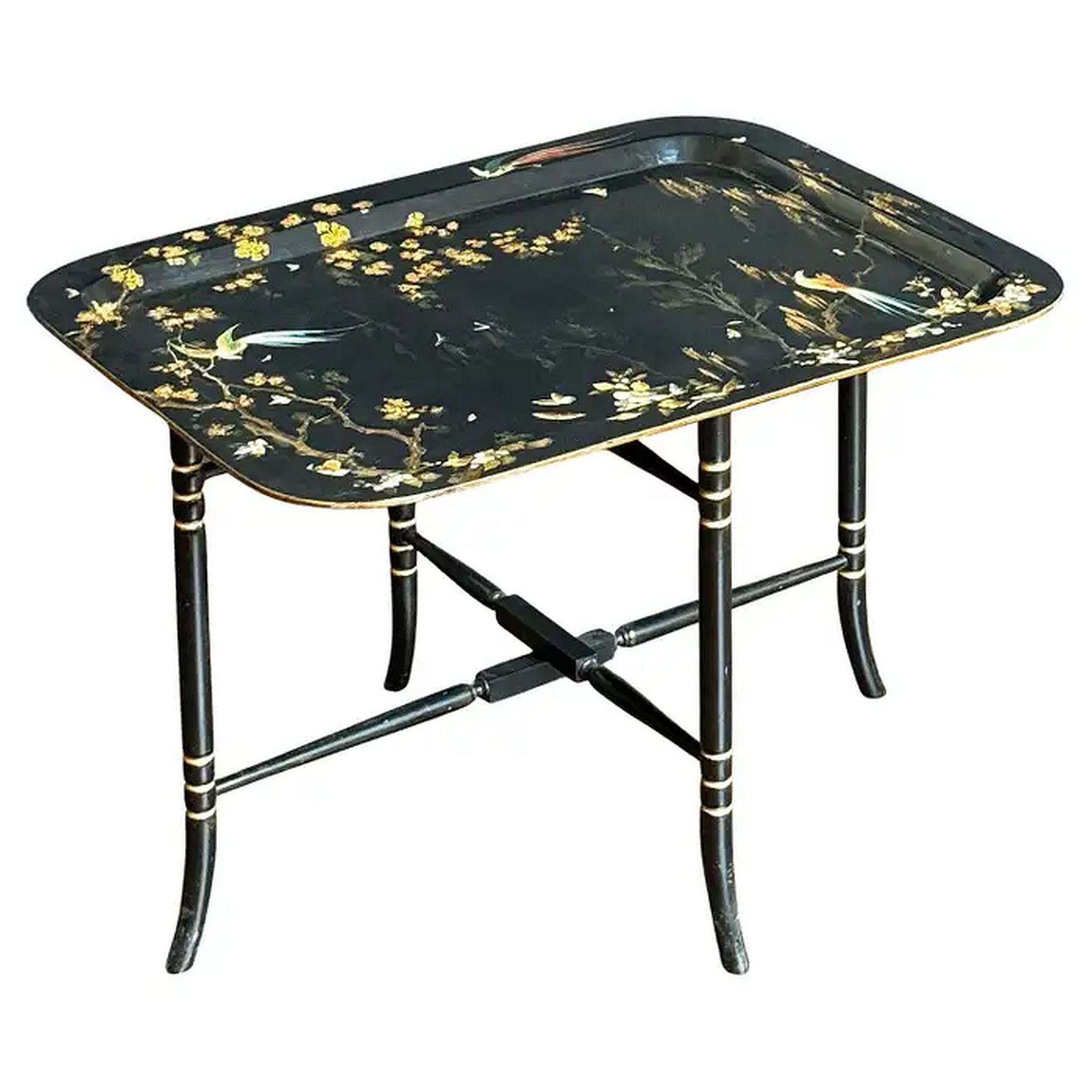 A beautiful English tray table or tray on stand from the Aesthetic Movement Period, featuring a rectangular tray of papier mache with a recessed center showing a decorative Chinoiserie painting of birds of paradise, with gilt trees and leaves. The tray fitted to a turned-leg ebonized stand in Regency-style gilt and black.