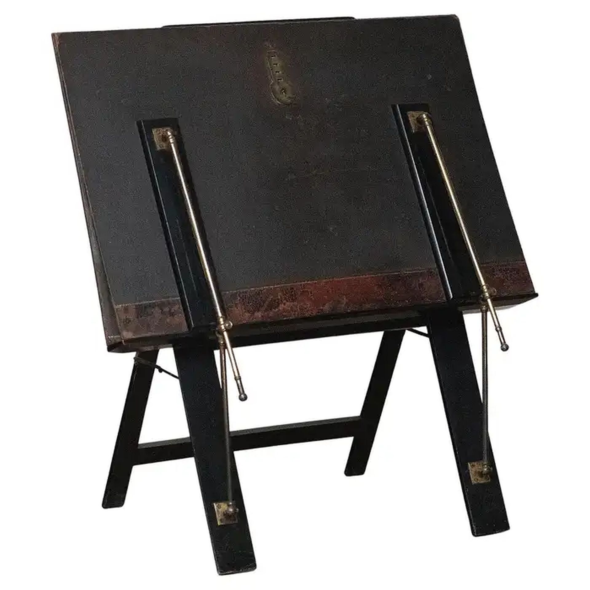 It is supported by a ebonised wood A-frame stand which closes with brass hinges.