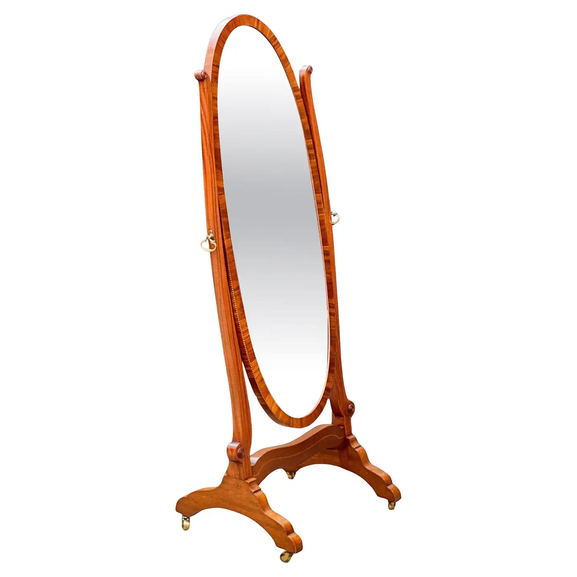 A fine large English cheval or full-length dressing mirror, in the Queen Anne style, from the Edwardian era, featuring an oval mirrored glass panel framed in mahogany with inlaid stringing around the circumference, mounted to a serpentine stretcher frame with decorative accents, on rolling casters.