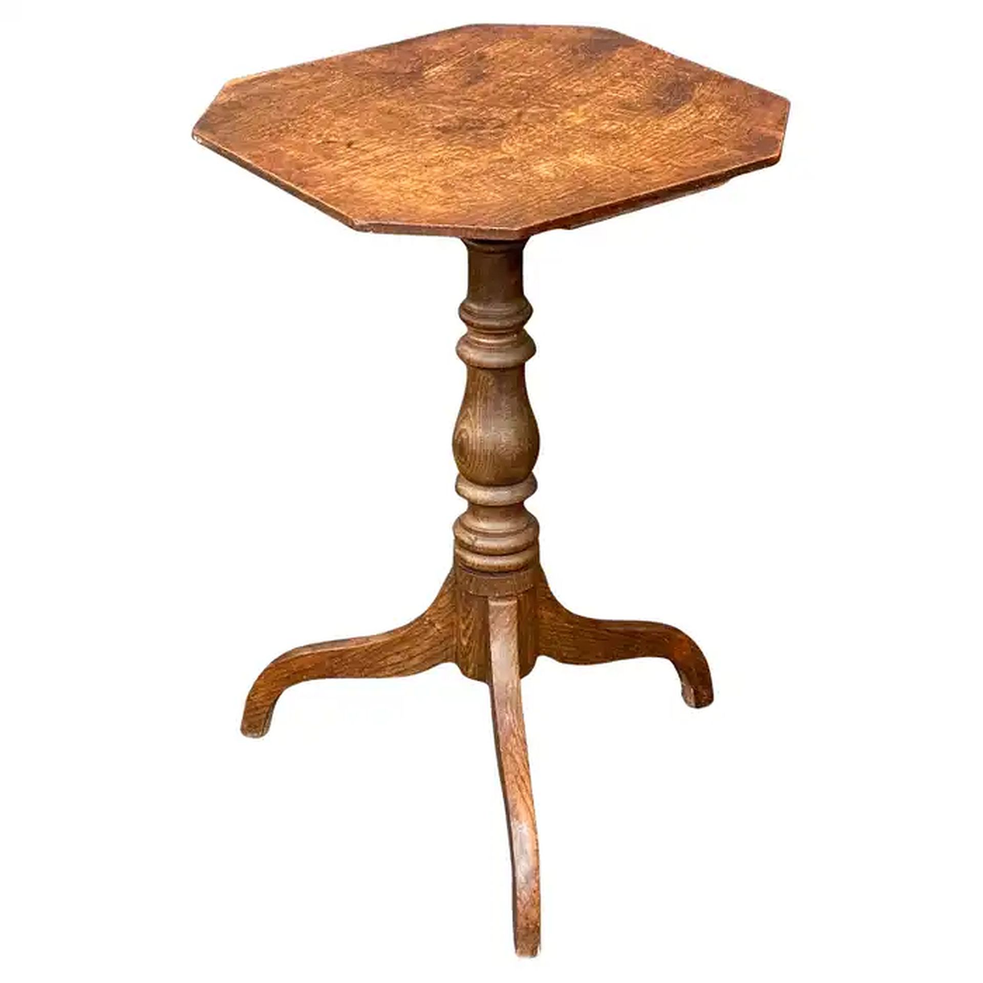 A fine English occasional table of oak, in the Georgian style, with an octagonal top atop a turned base and tripod legs.