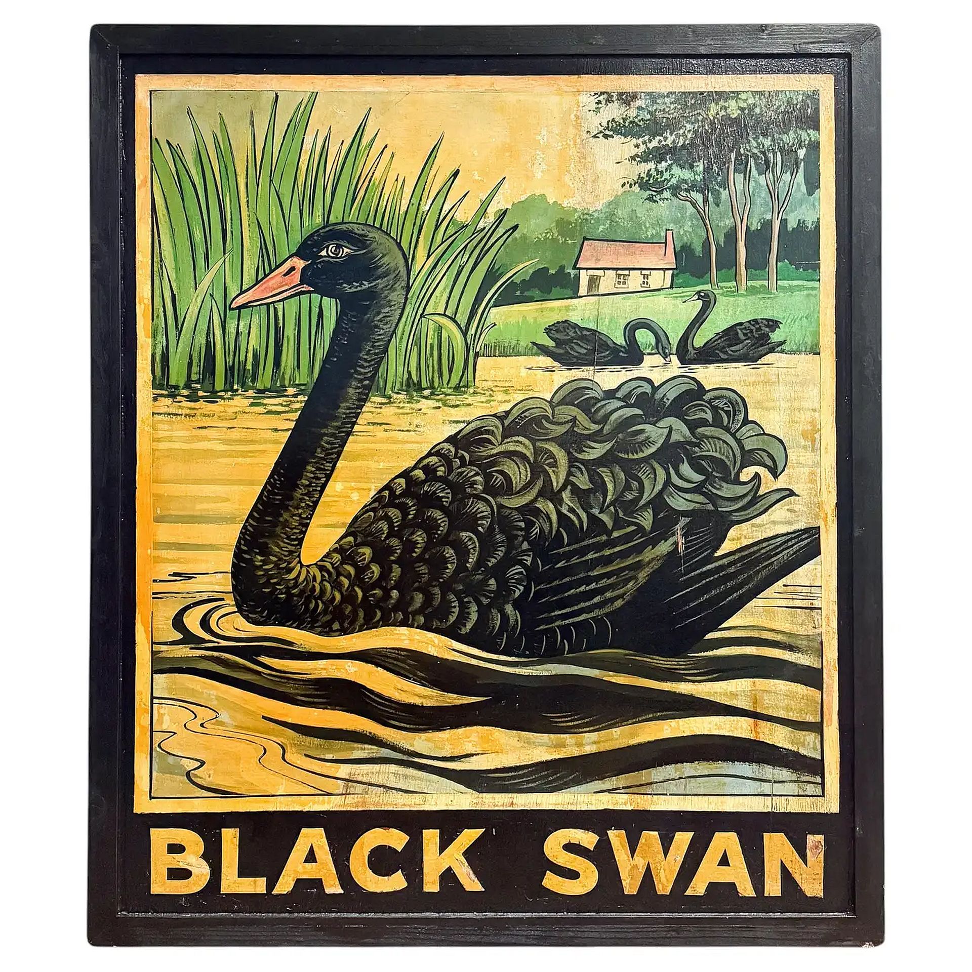 An authentic English pub sign (one-sided) featuring a gorgeous painting of a black swan on water, with two swans in the background, along with reeds and a small home, framed in black, titled: Black Swan.