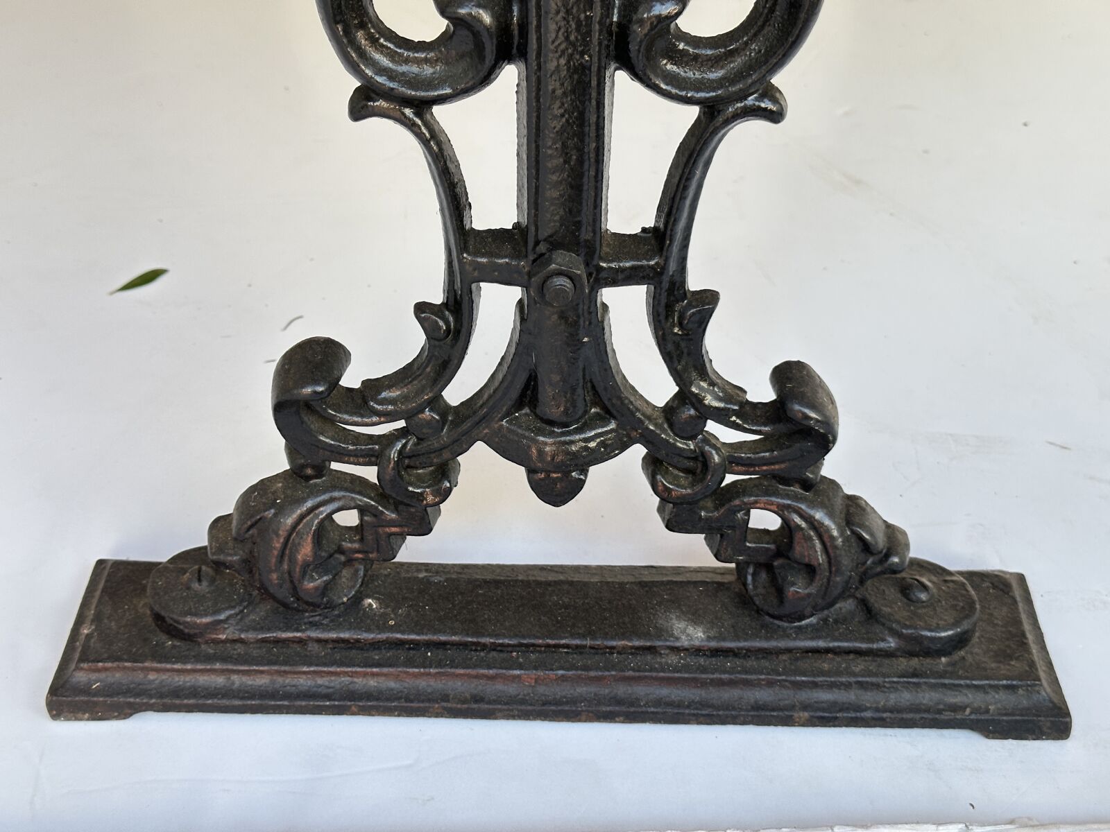 A fine English console bar or pub table from the 19th century, with moulded rectangular top, featuring a stained wood surface with ebonized edge, set upon a base of figured cast iron legs and supports.