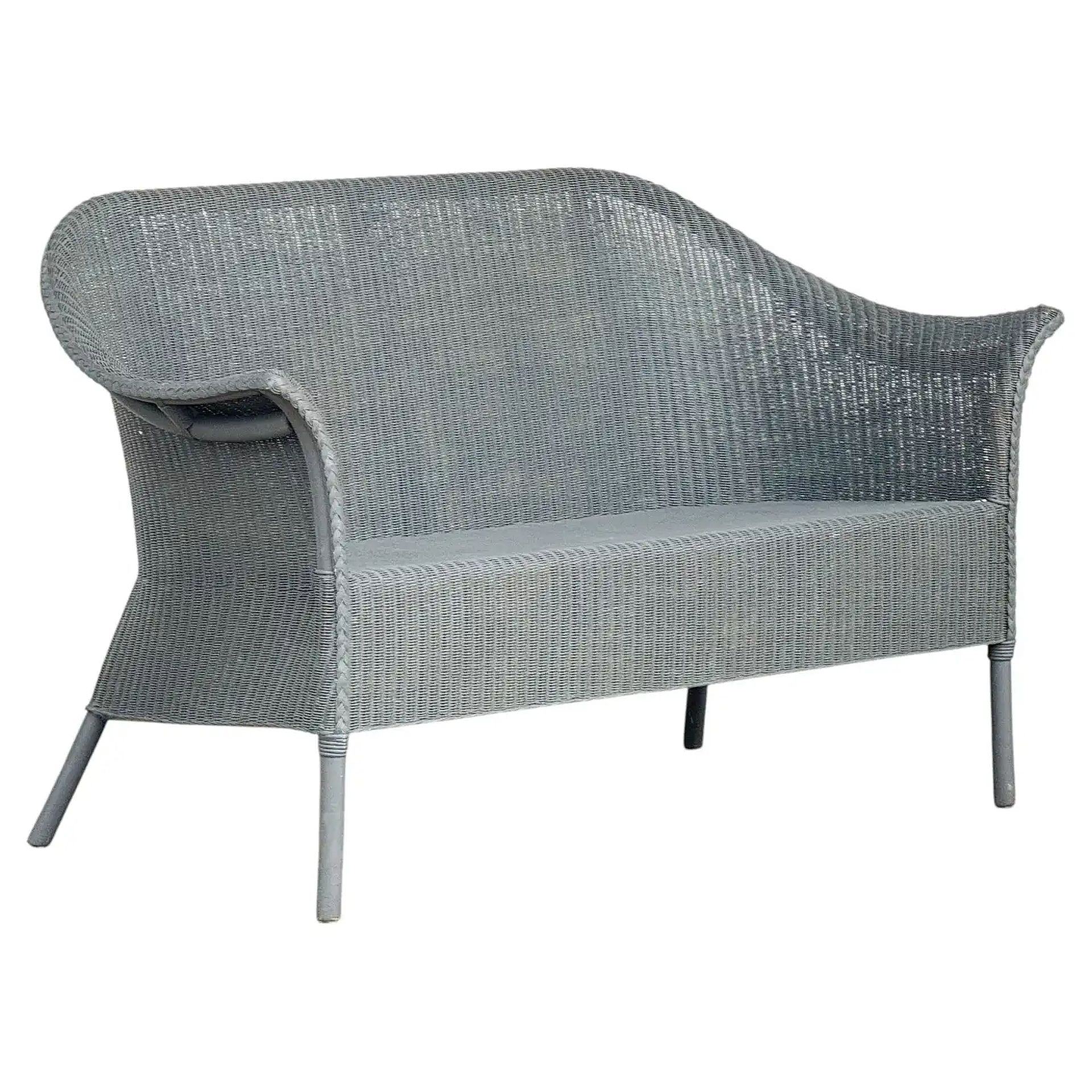 A fine Lloyd Loom settee or seating bench sofa, synonymous with classic English style, featuring a settee of woven wicker and wire over a wood frame stretcher.