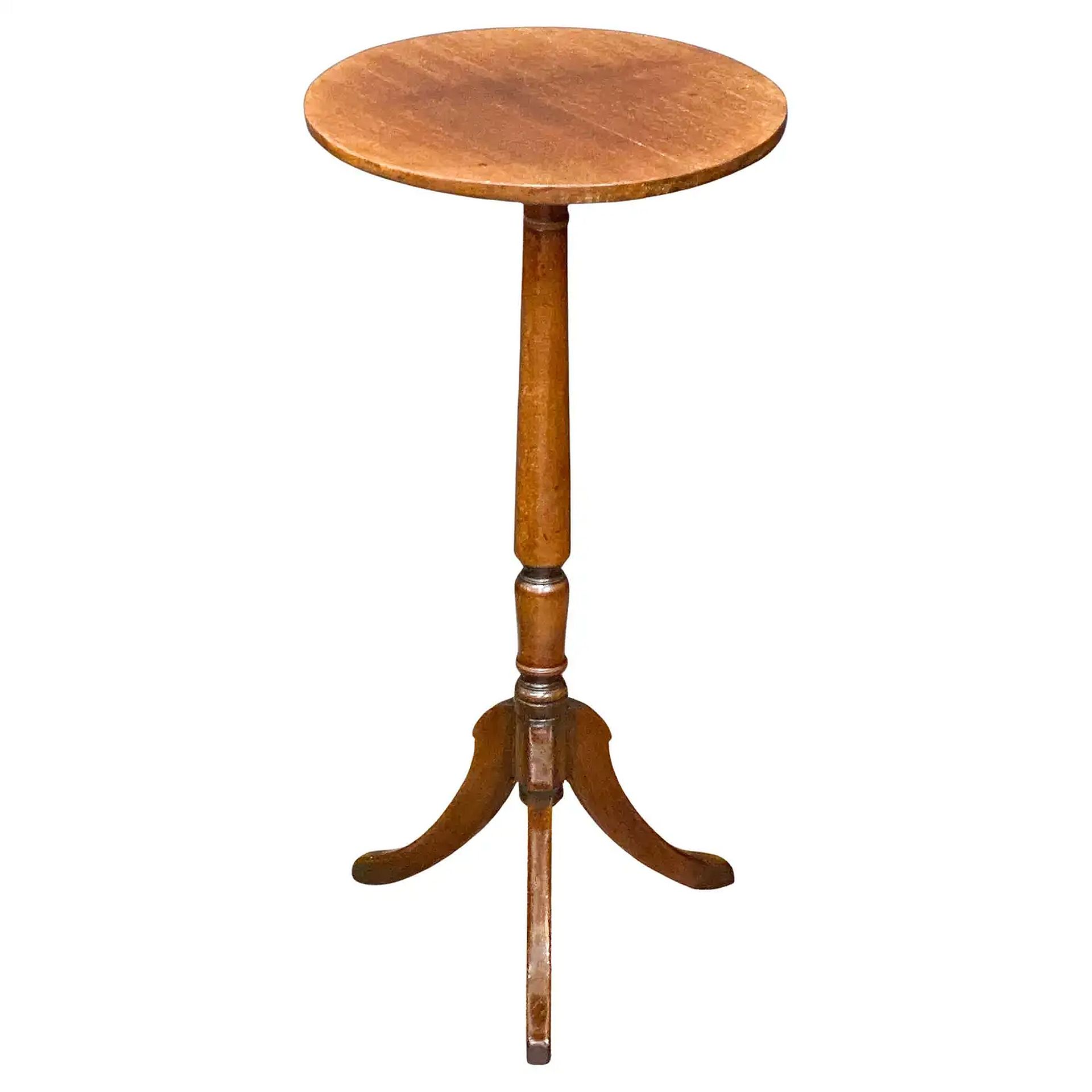 An English wine or cocktail table of mahogany featuring a round top with a 13 3/4 inch diameter mounted upon a turned column pedestal with tripod base.