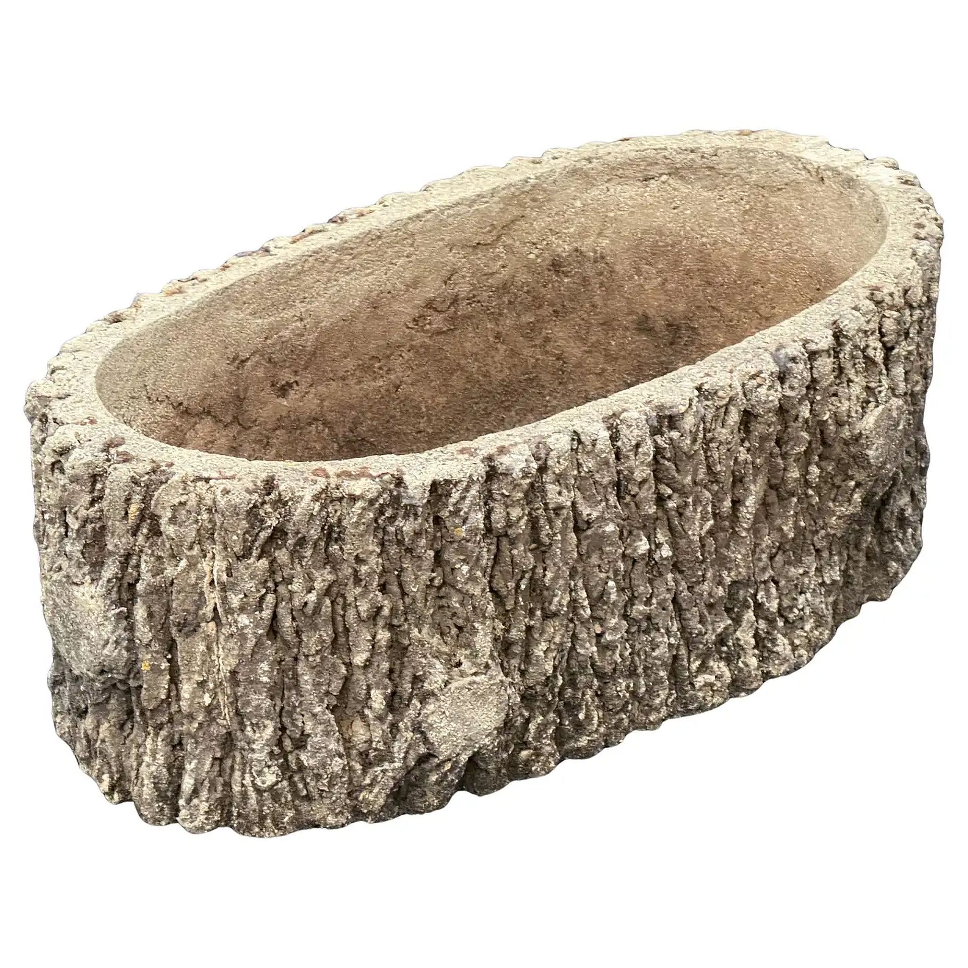 A fine French garden oval trough or planter pot of composition stone, featuring a faux bois or tree bark exterior around the circumference.