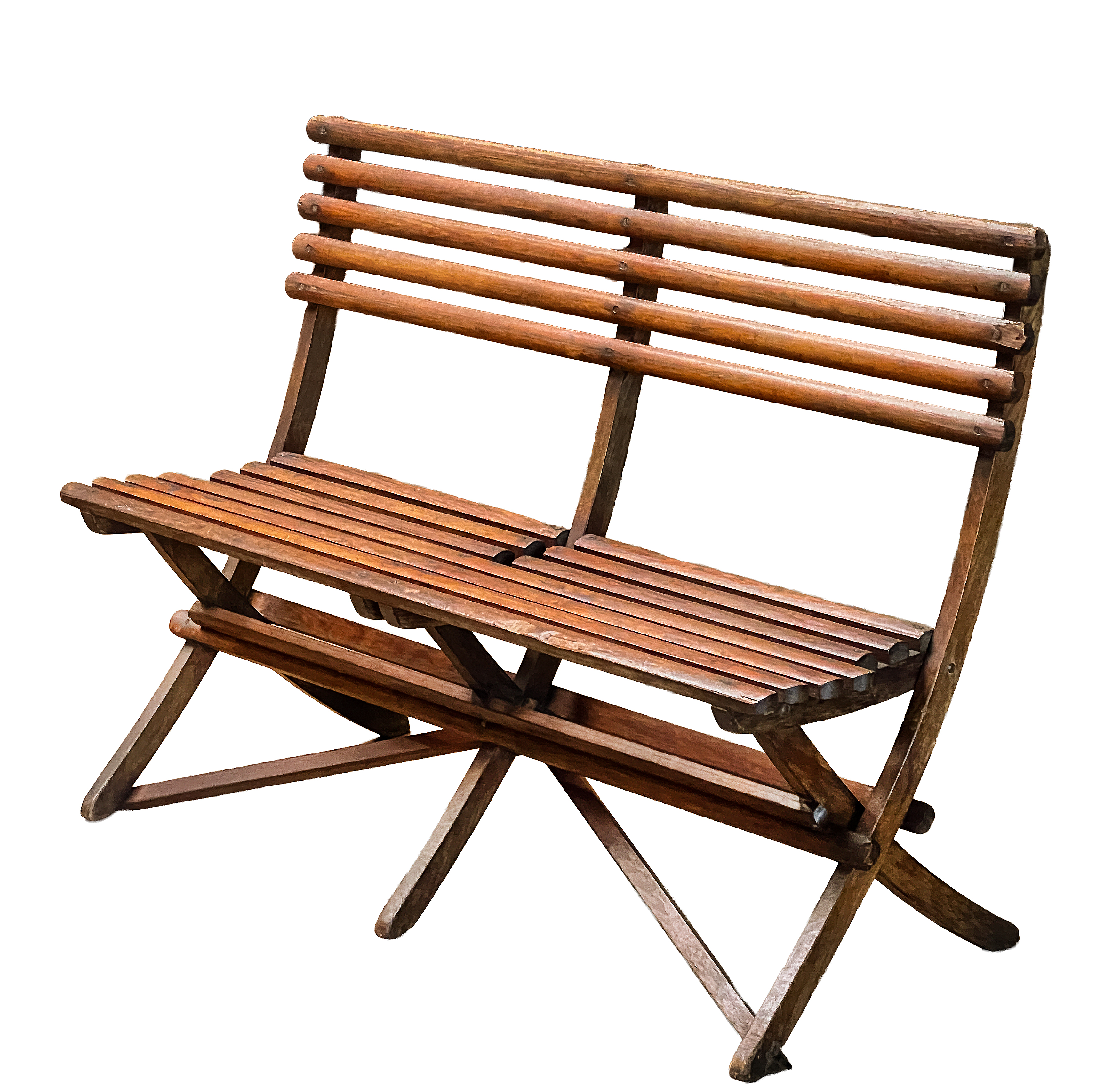 A fine French folding garden bench or seat featuring a comfortable frame of slatted wooden back and seat with trestle base, offering clean, elegant lines along with strength and support.
