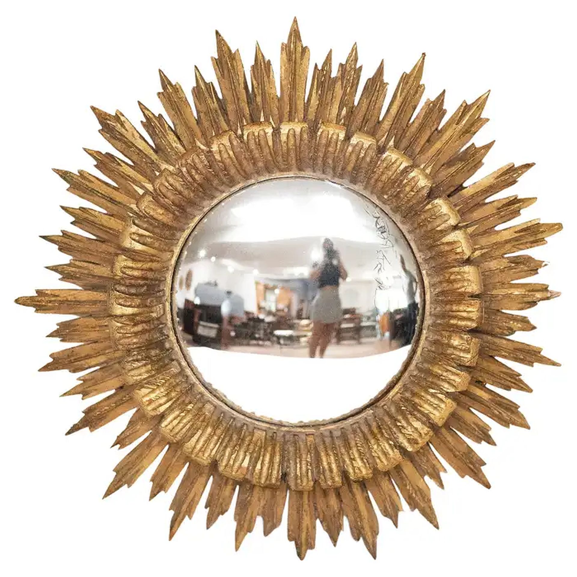 A lovely French gilt sunburst (or starburst) convex mirror with beautifully gilded wooden rays arranged around the mirror plate glass center.