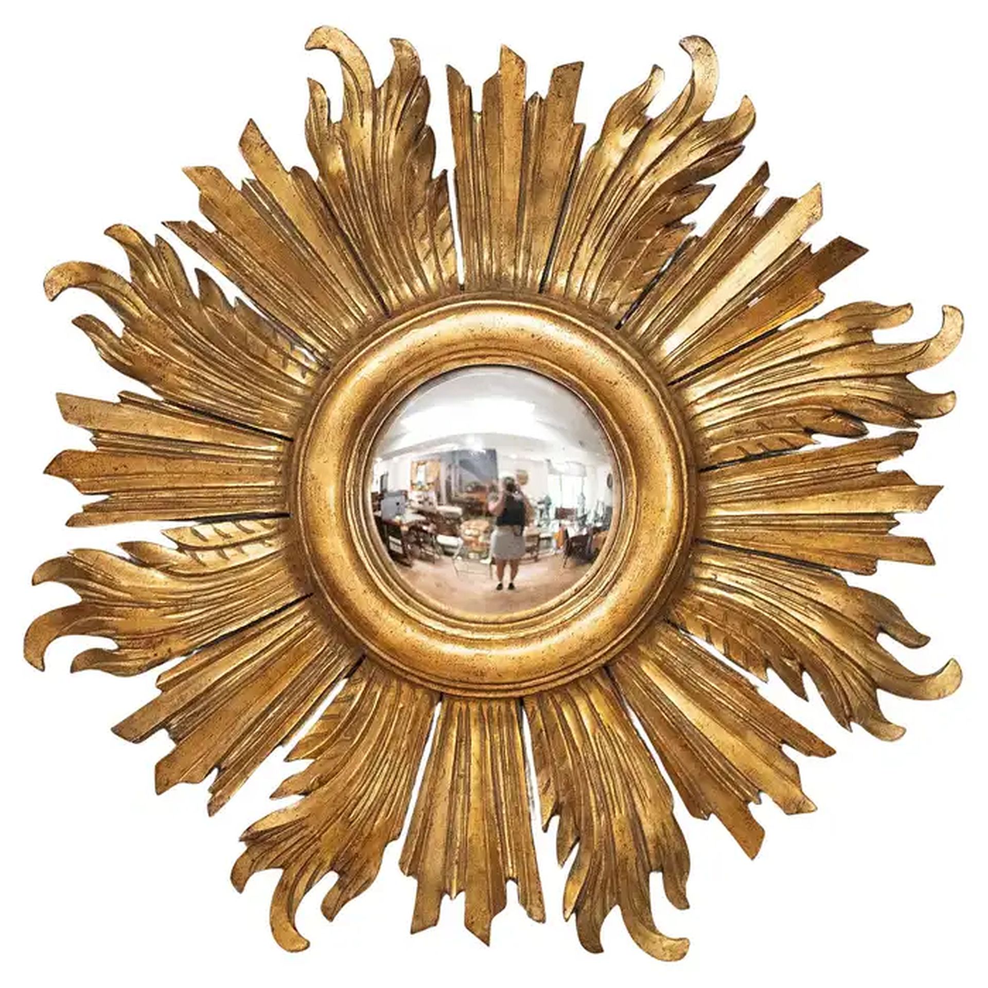 A lovely French gilt sunburst (or starburst) convex mirror with beautifully gilded wooden rays arranged around the mirror plate glass center. Alternating straight and longer curved rays.