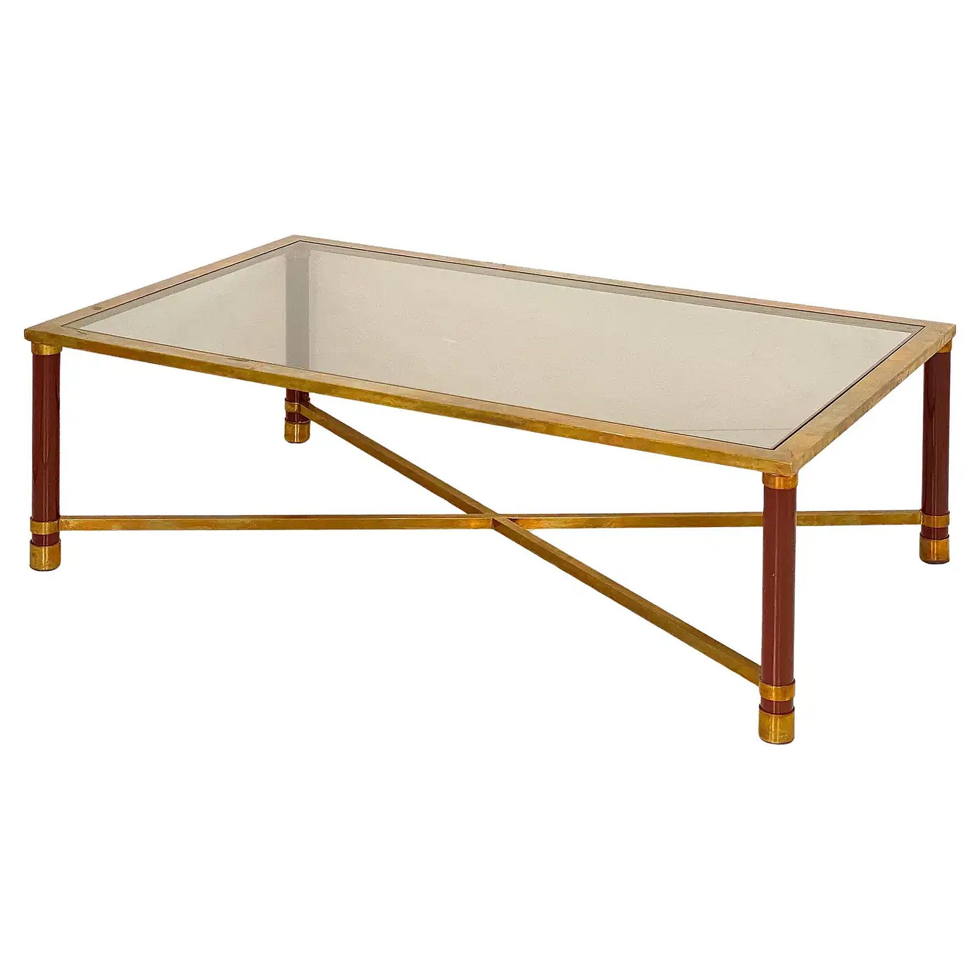 A fine French Modern rectangular cocktail or coffee low table, featuring an elegant brass frame with an inset top of smoked glass and set upon four enameled column legs with an x-shaped stretcher base.
