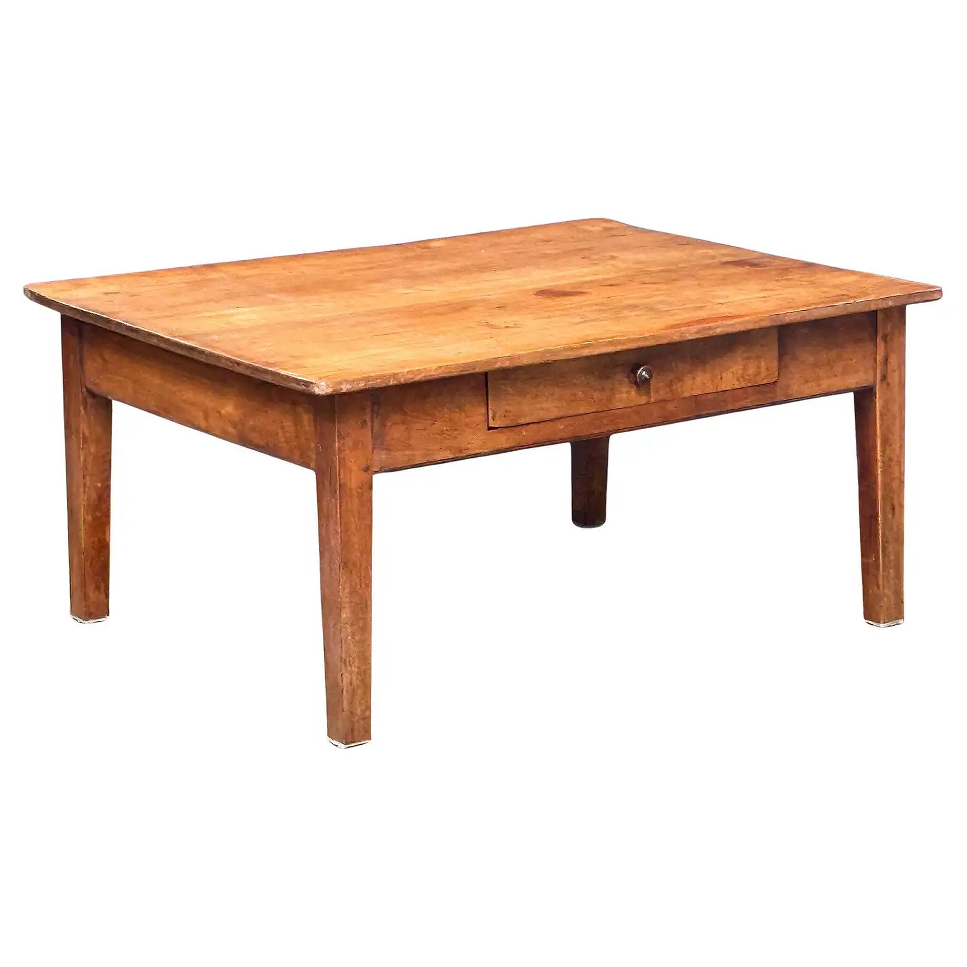 A large French cocktail or coffee (low) table of patinated cherry wood, featuring a handsome rectangular plank top set upon a frame of four pegged and tapered legs and one side drawer with knob pull of turned wood.
