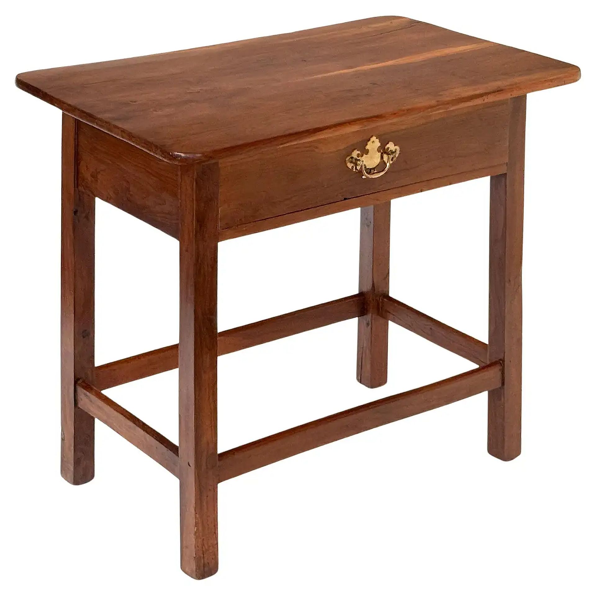A fine French end or serving side table of patinated cherry wood, featuring a rectangular plank top with lightly rounded corners, over a frieze with one-drawer and brass pull, resting on a sturdy square-legged stretcher frame.