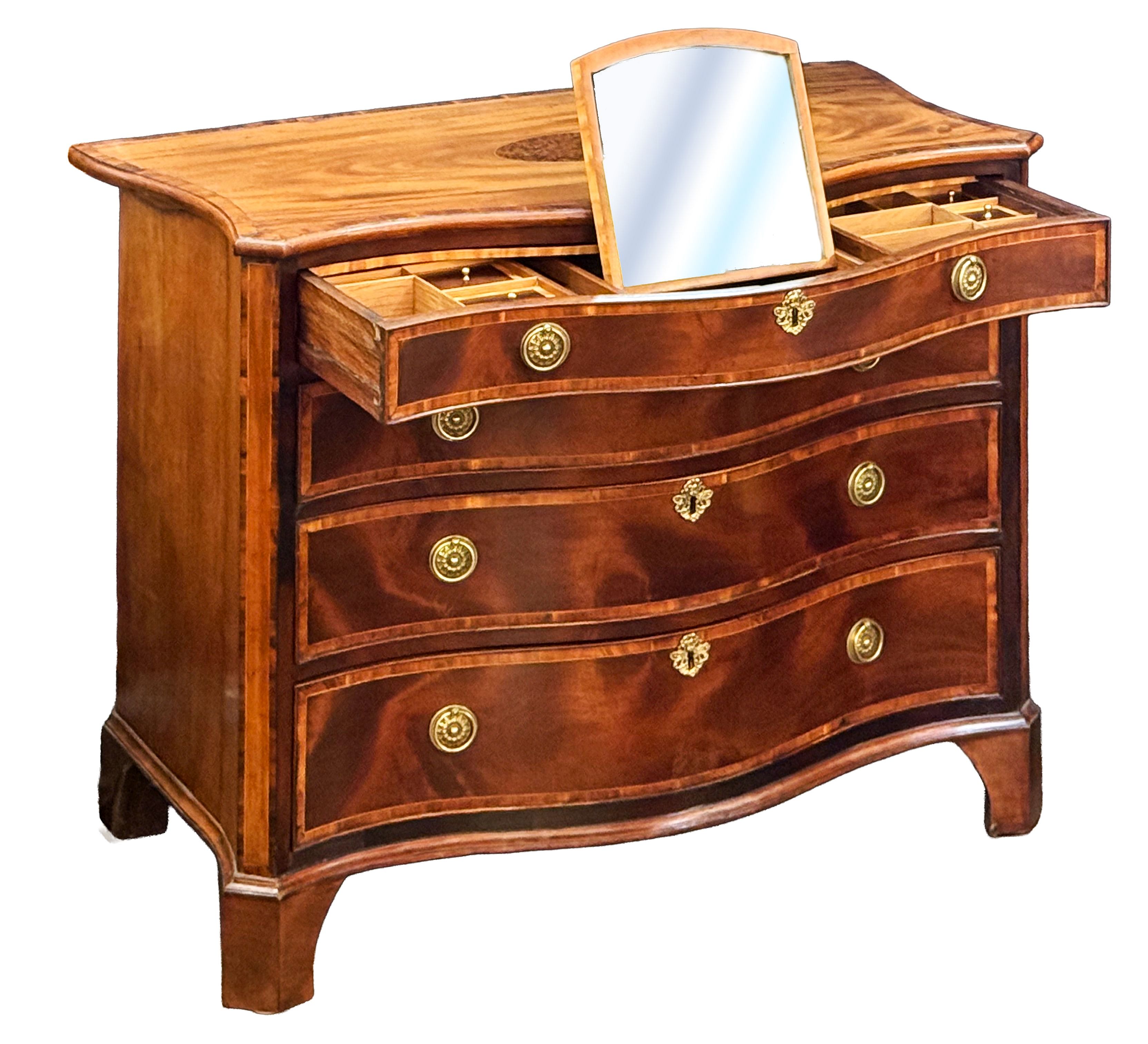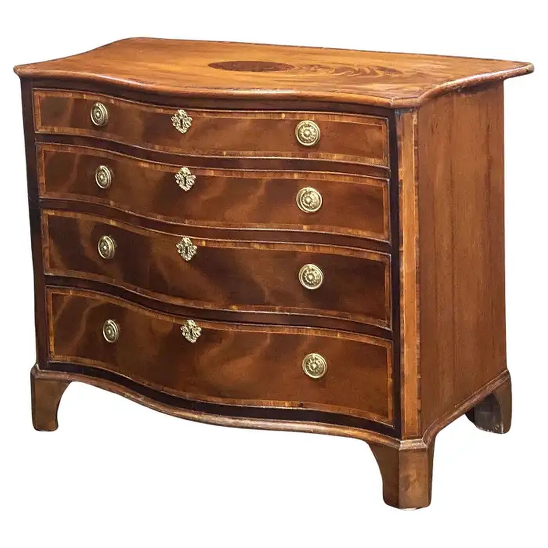 A fine period George III serpentine-front chest of drawers of figured mahogany and satinwood - a hallmark of 18th-century English furniture design.