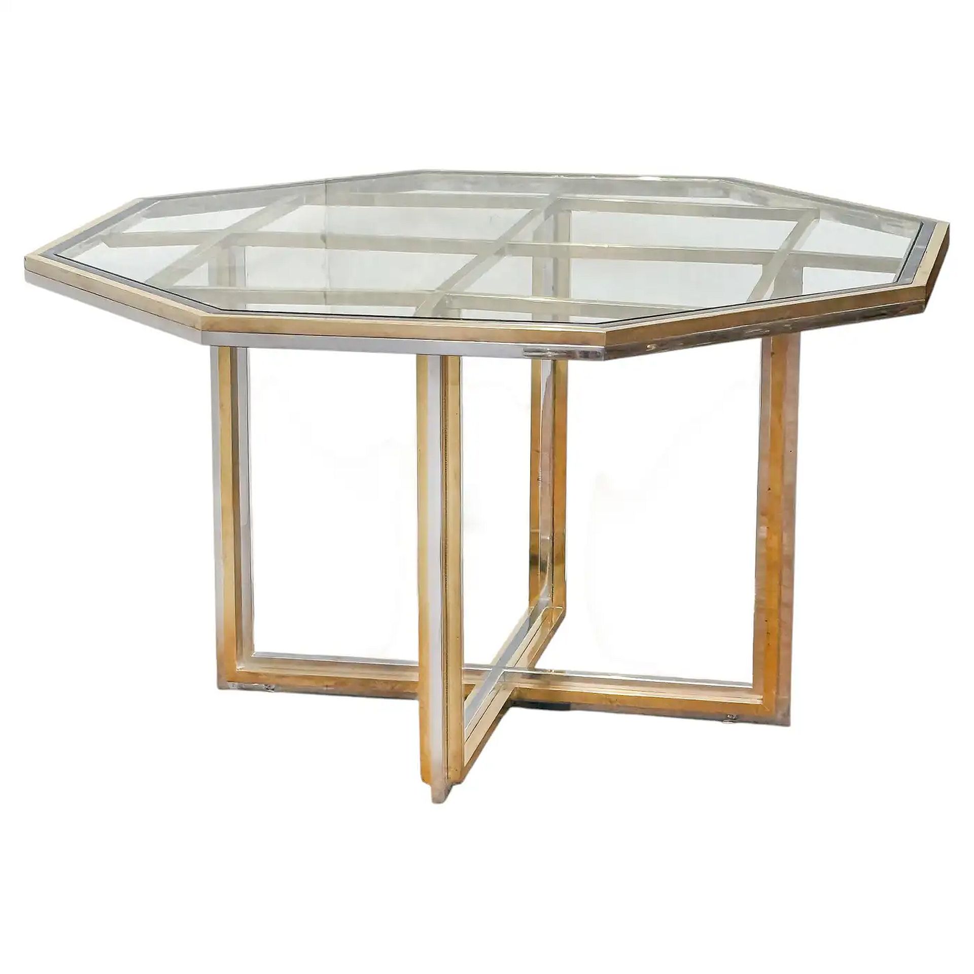 A fine center or dining table from Italy in the Hollywood Regency or Modern style, featuring an octagonal glass top over an elegant frame of brass and chrome with x-shaped base, attributed to the celebrated designer, Romeo Rega.