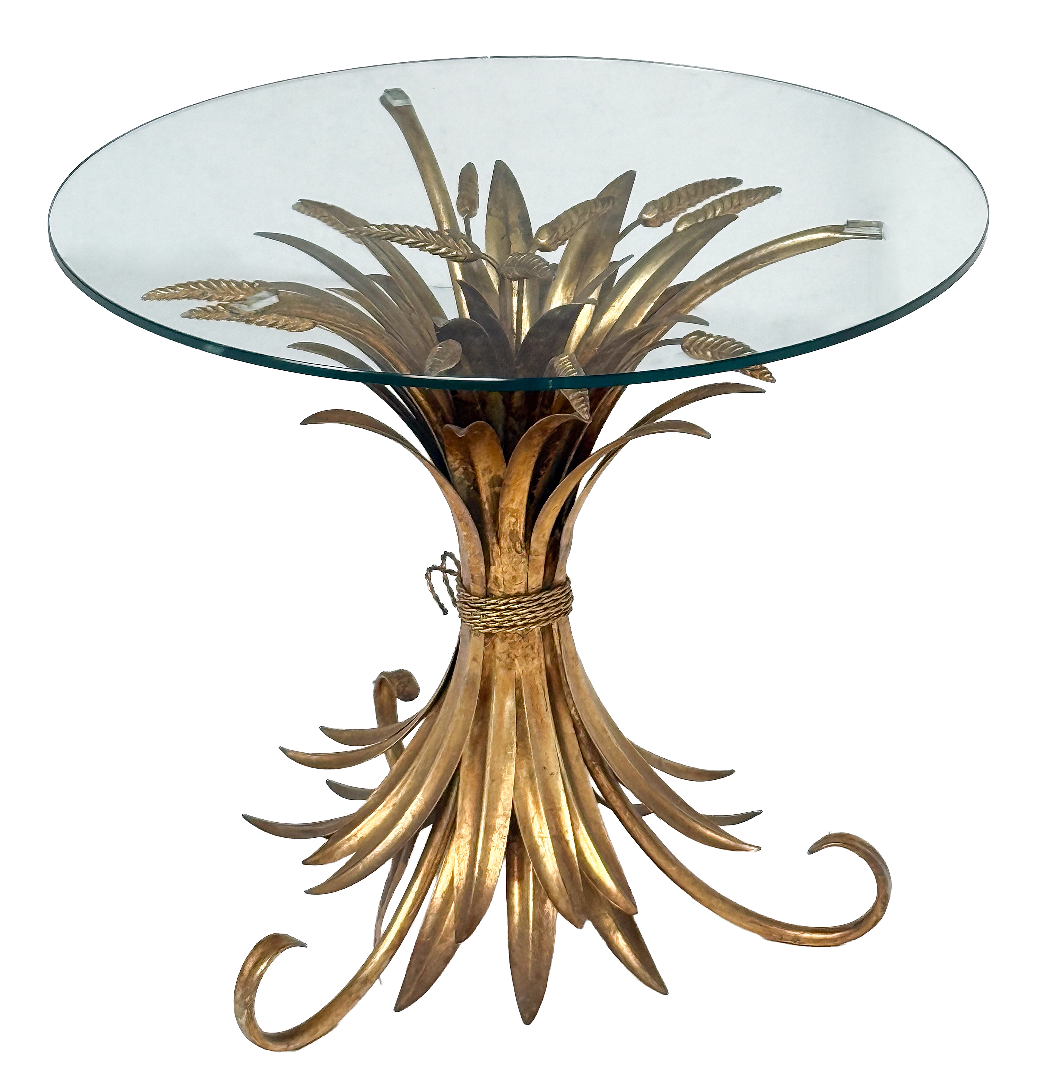 A fine Italian wheat sheaf cocktail or coffee table (or low table) from the Hollywood Regency era, featuring a round glass top set upon a beautifully designed and constructed sheaf of wheat base, with original gilt finish. Note: some oxidation to the finish.