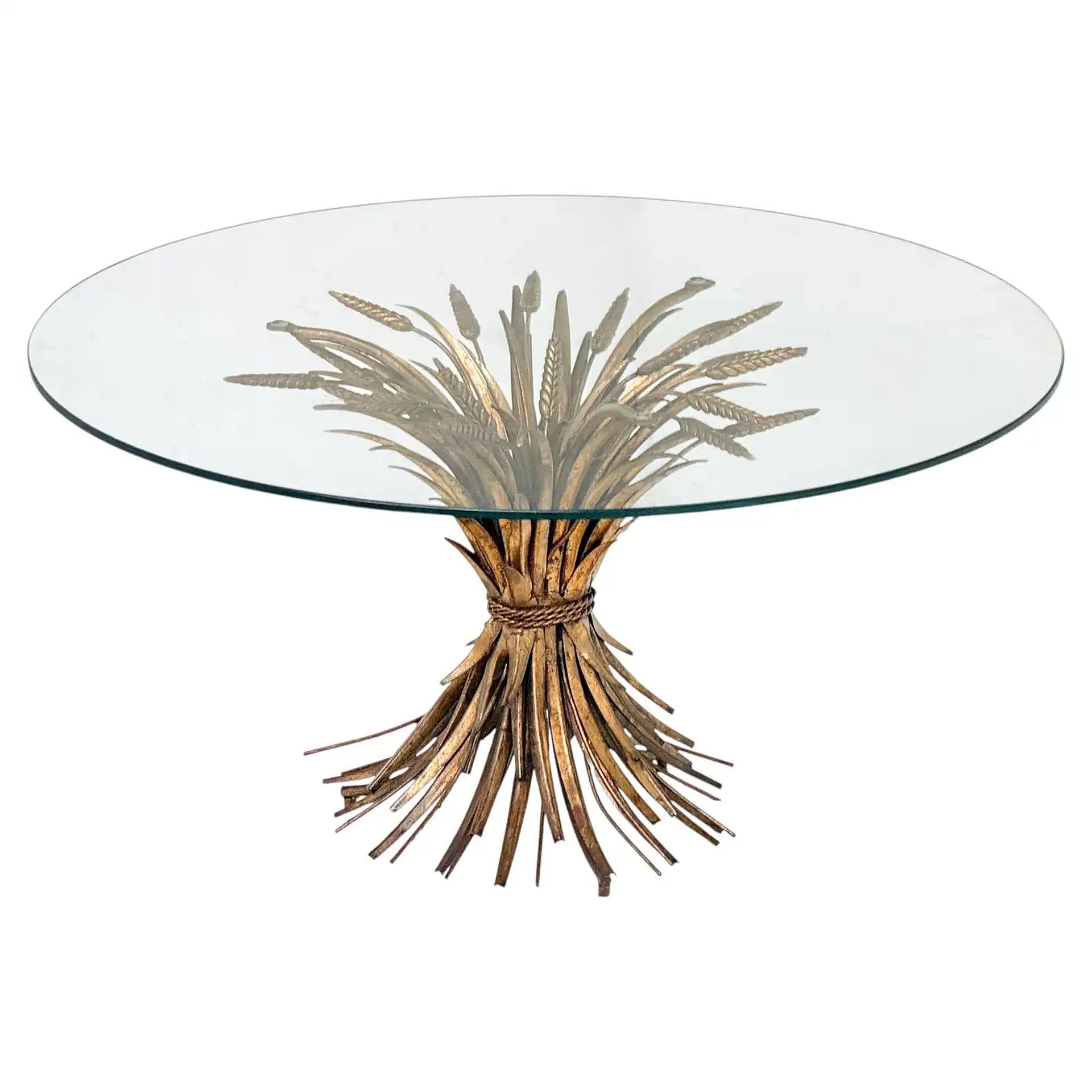 A fine Italian wheat sheaf cocktail or coffee table (or low table) from the Hollywood Regency era, featuring a round glass top set upon a beautifully designed and constructed sheaf of wheat base, with original gilt finish. Note: some oxidation to the finish.