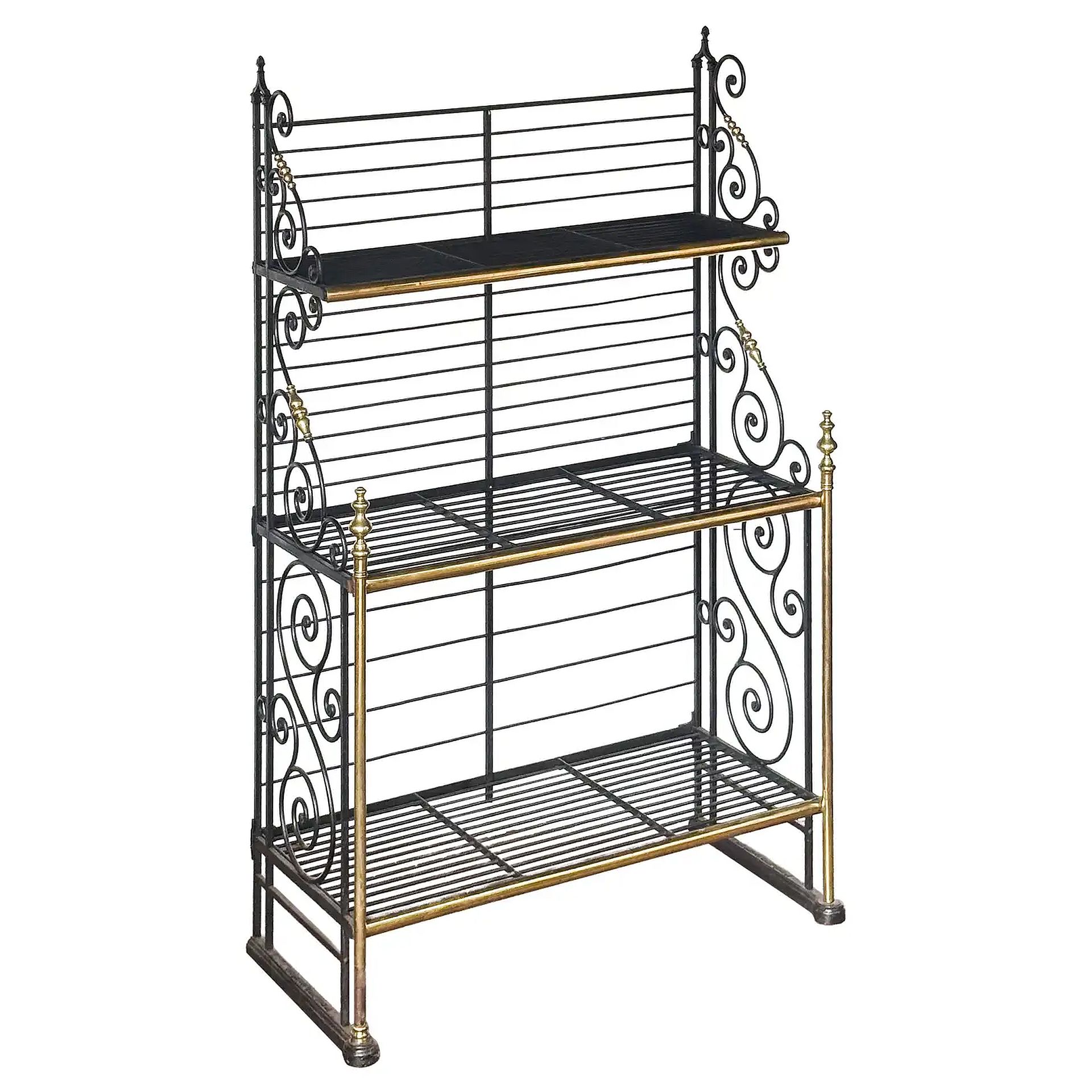 A fine authentic French baker's rack or boulangerie display stand of wrought iron with decorative brass trim and finials, featuring scrolled dividing panels and three levels of shelves.