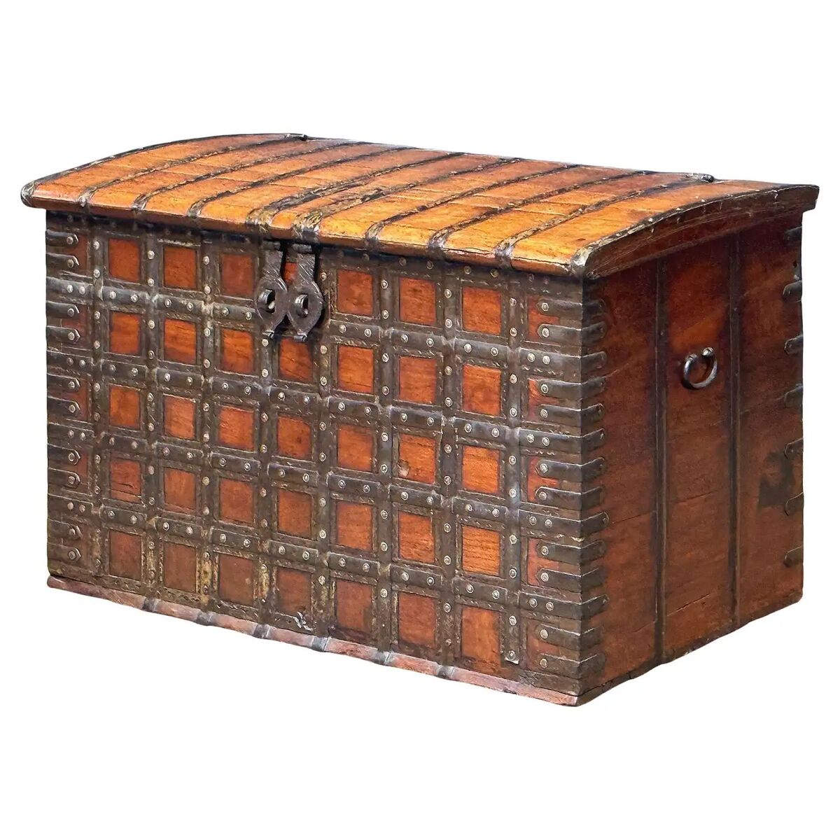 A handsome large 19th century rectangular iron-bound wooden coffer box or Rajasthan trunk from British Colonial India (The Raj) featuring a hinged top hatch with storage inside.