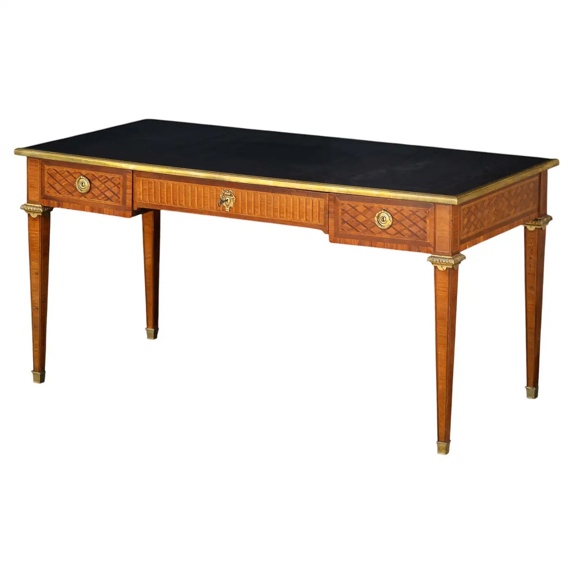 A fine French bureau plat writing table or desk of tulipwood with boxwood inlay, of elegant proportions, in the Louis XVI style - featuring an inset black leather top, over a frieze that is finished on all sides, showing three drawers to the front, complete with handles and a working key, accented with the original ormolu mounts and beautiful geometric marquetry, standing on tapering legs with brass feet.