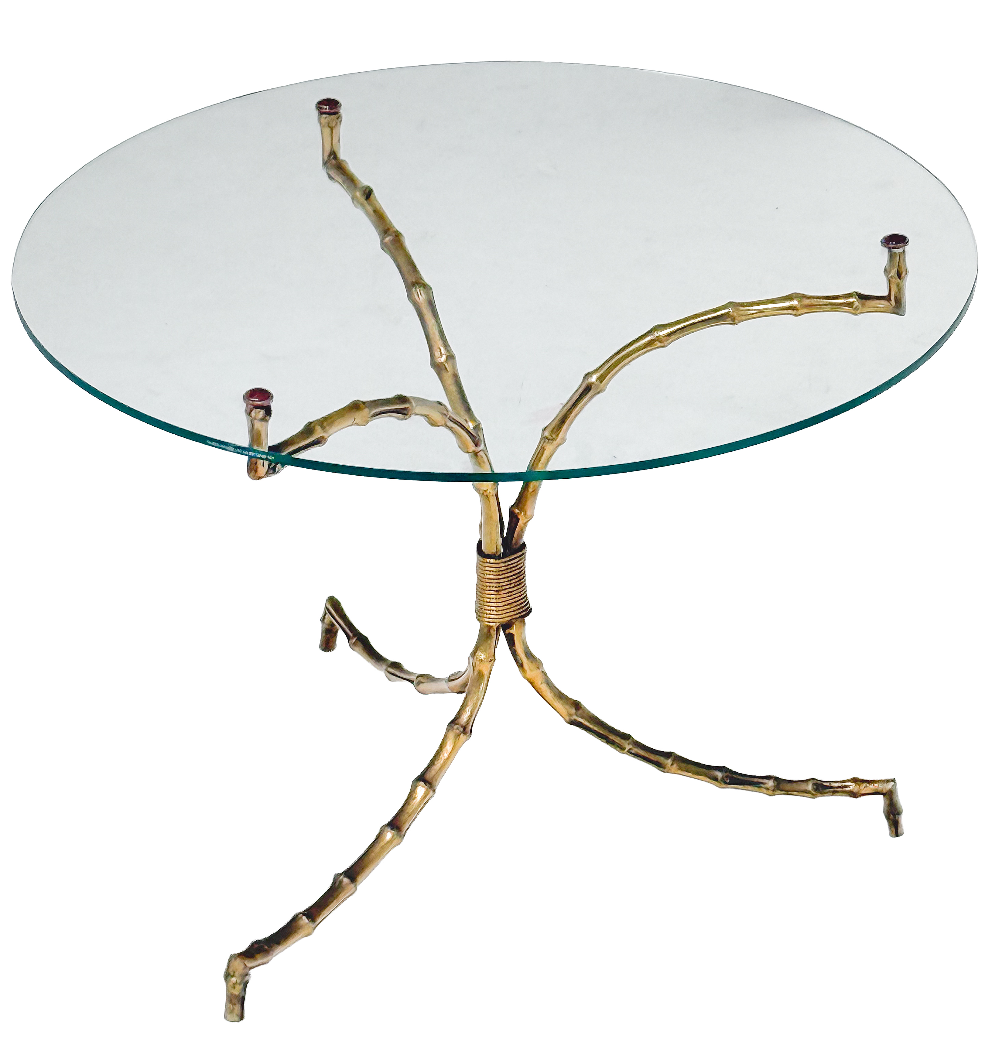 A fine French cocktail or coffee table (or low table) attributed to the celebrated design house, Maison Baguès - from the Hollywood Regency era - featuring a round glass top set upon a beautifully designed faux bamboo tripod base, of brass with original gilt finish.