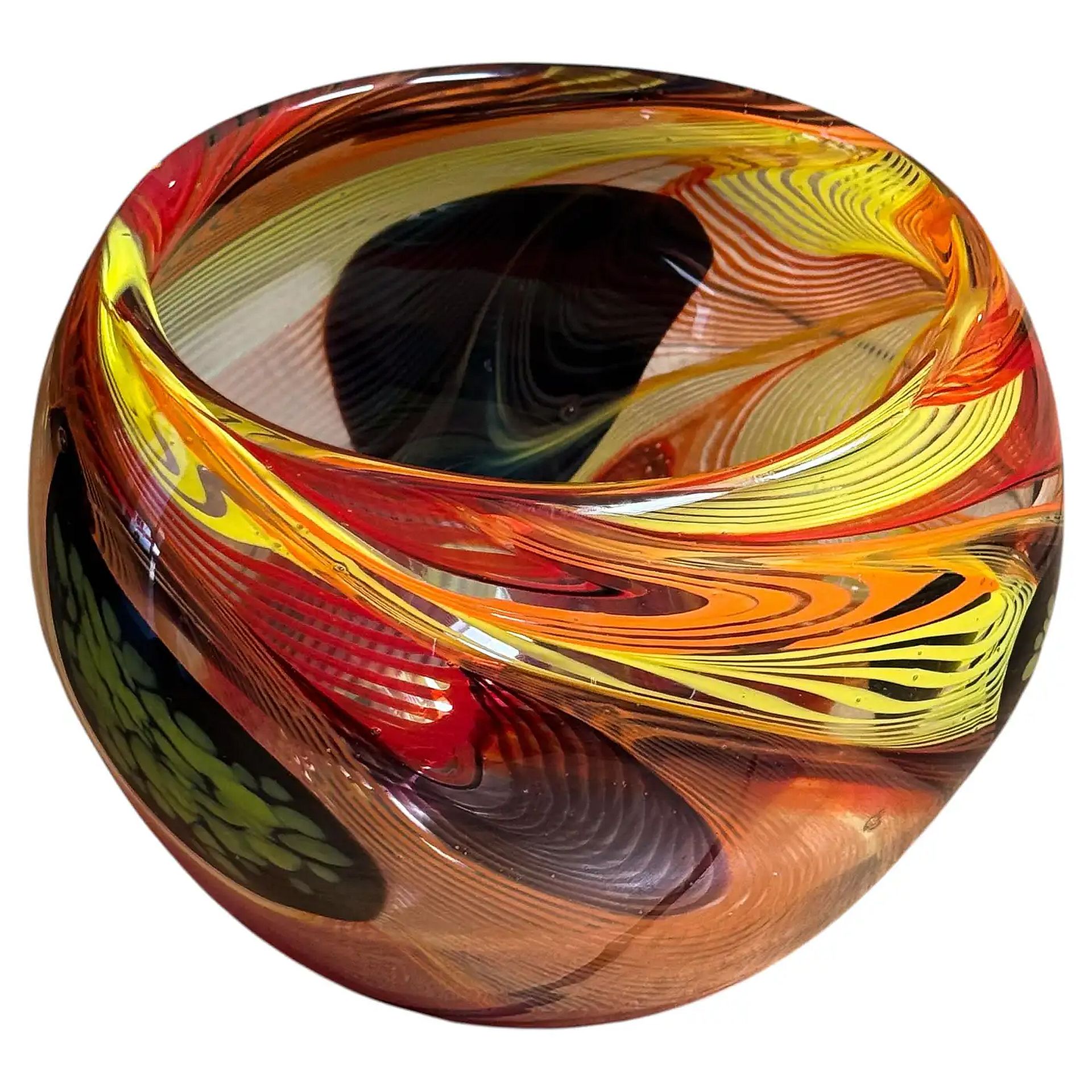 A fine Mid-Century Murano art glass bowl from Italy, handcrafted by artists using traditional glassblowing techniques - featuring a vibrant, swirling kaleidoscope design of red, yellow, orange, green, black, and clear glass.