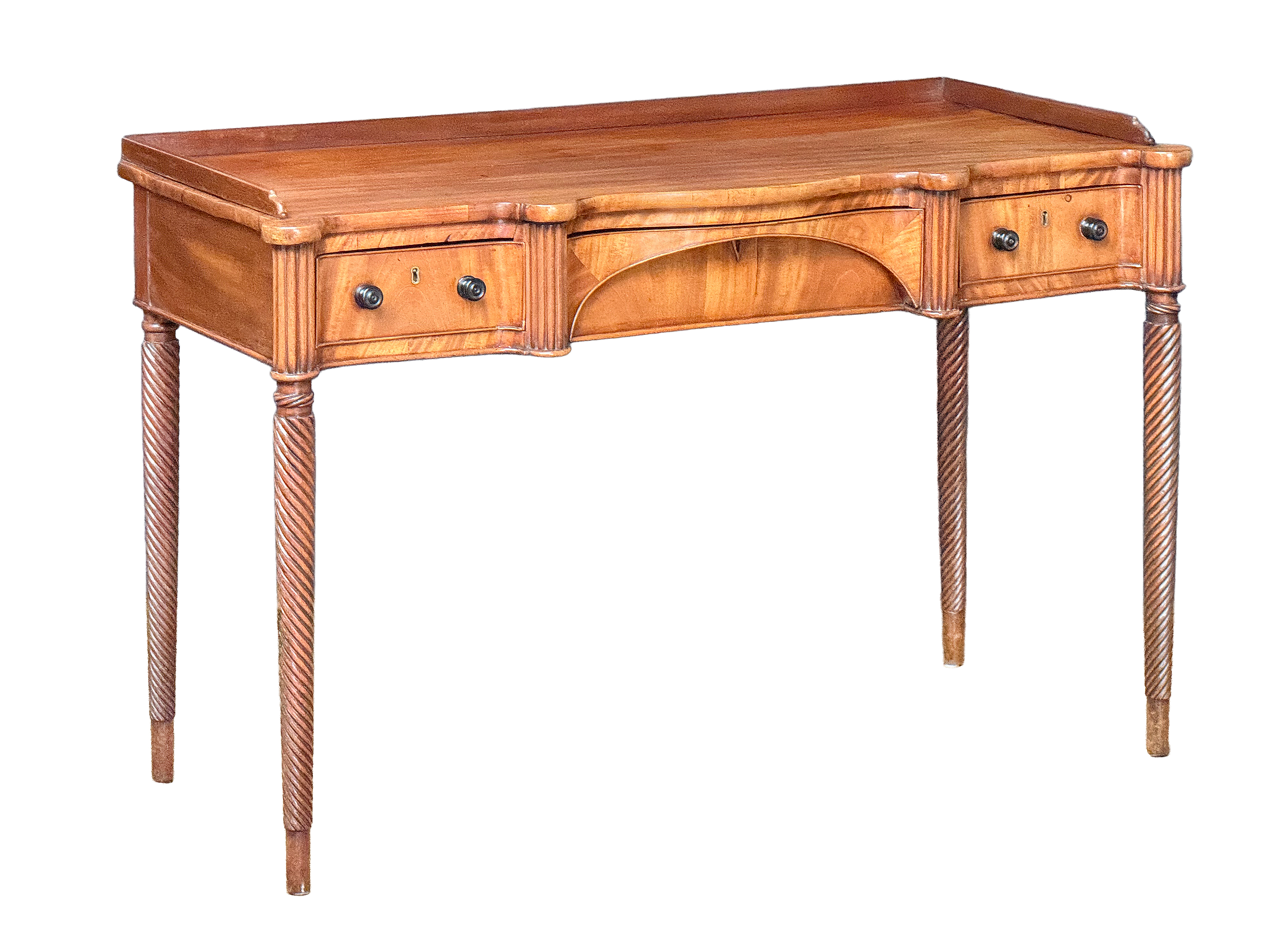 An exquisite Scottish writing table or console desk of mahogany from the Regency period, featuring a beautifully moulded top with shaped edge and gallery, over a frieze of three drawers. Opposing side drawers are fitted with ebony knob pulls, center drawer showing a beaded edge serpentine front and interior with retractable felt writing surface. The whole upon turned tapering spiral legs.