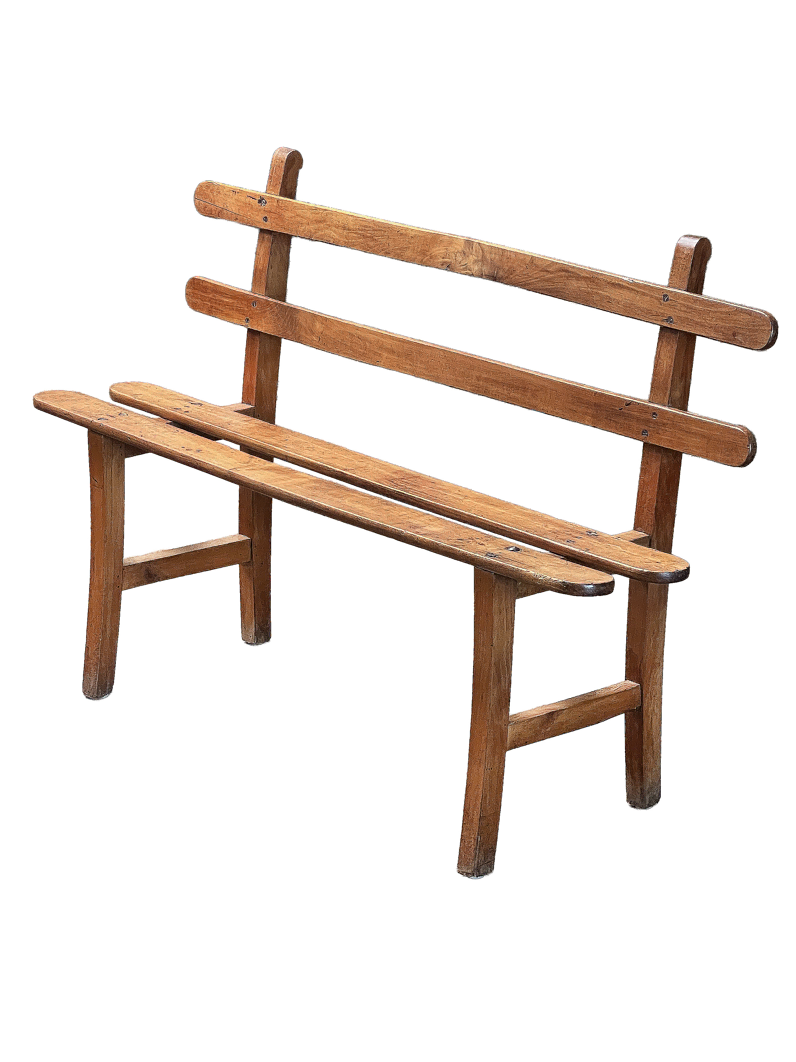 The rounded edges of the back and seat slats add a subtle refinement, while the clean, functional lines reflect the bench’s pastoral origins.