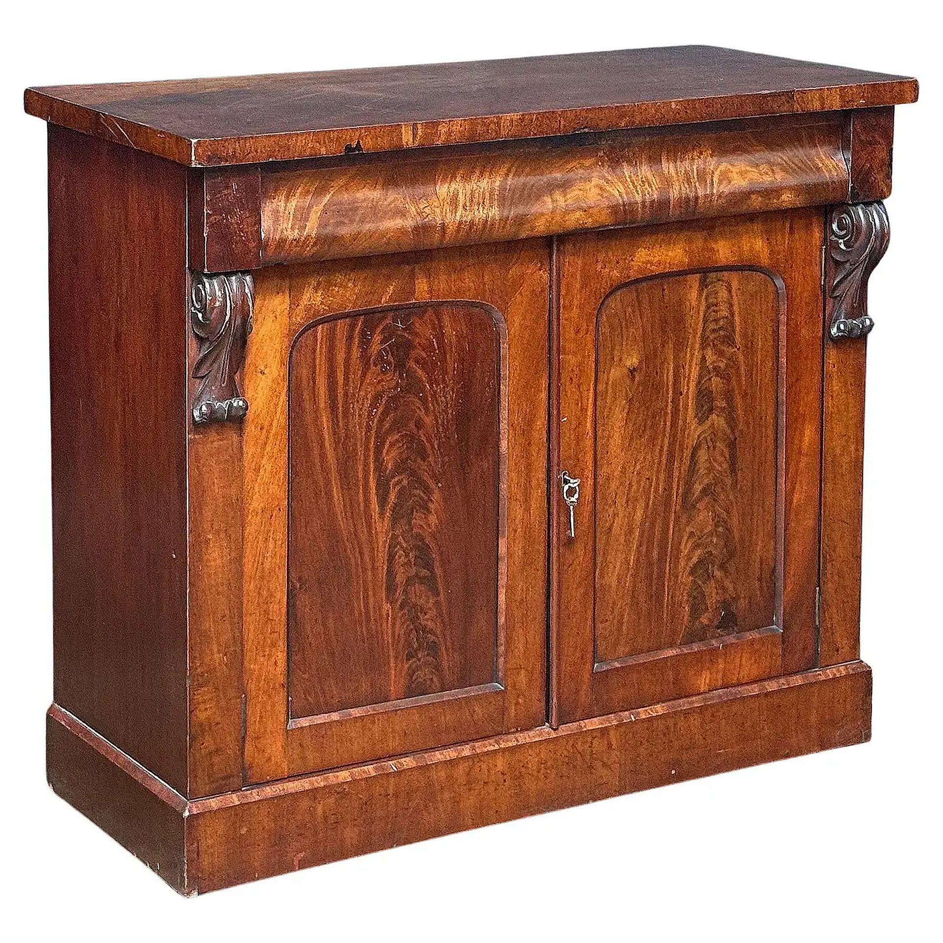 A fine English console sideboard or chiffonier server of flame-cut mahogany from the William IV period, featuring a moulded-edge rectangular top, supported by scrolling acanthus leaf brackets and a solid back, over a hidden frieze drawer above two paneled cupboard doors enclosing two shelves, and resting on a raised plinth base.