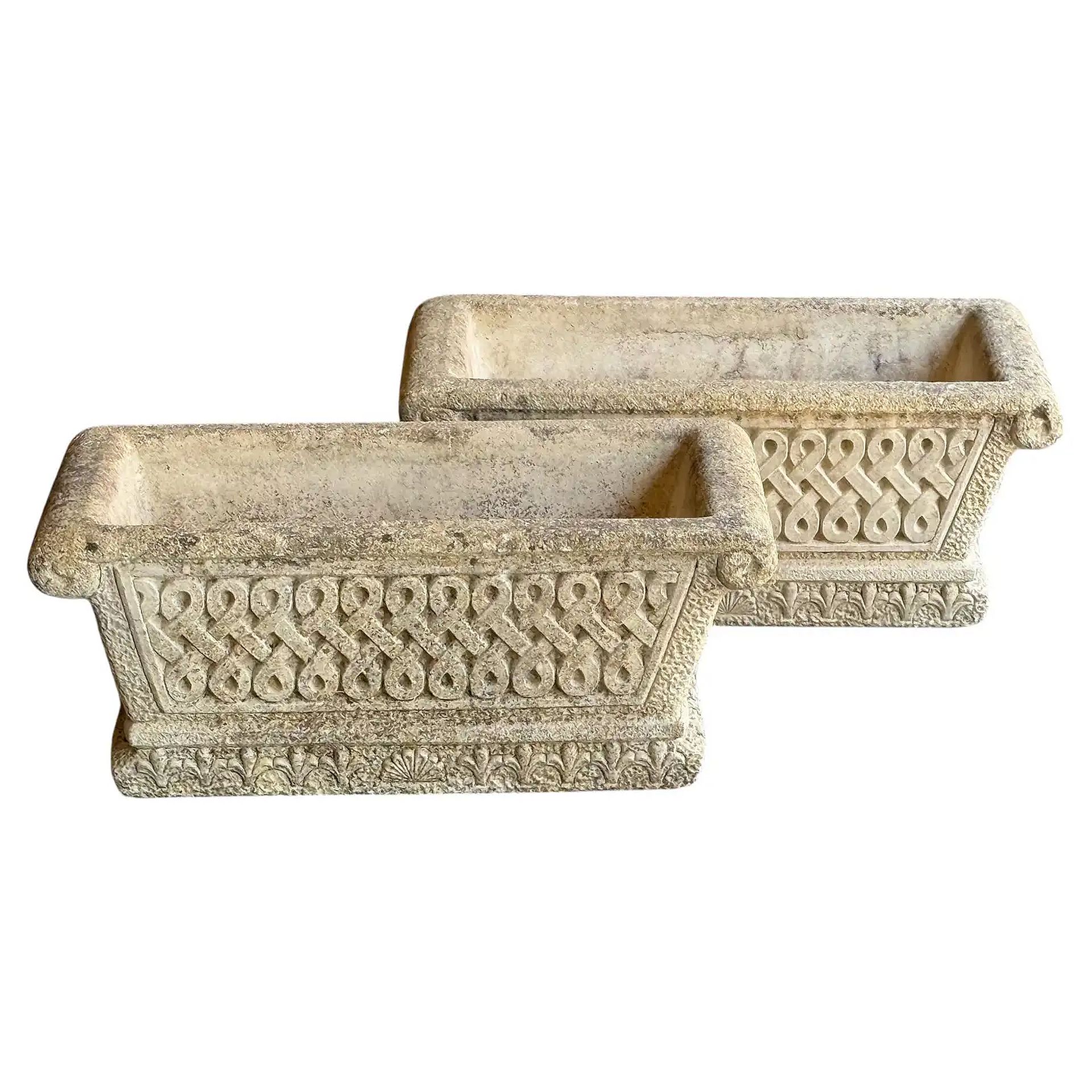 A fine pair of Cotswold Studios rectangular garden planters or troughs of composition stone from England - each featuring a Celtic knot or lattice decorative relief and original, naturally-weathered patina.