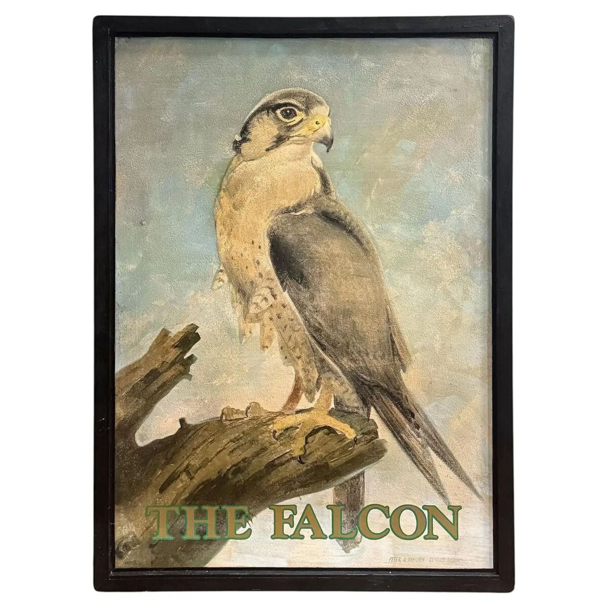 An authentic English pub sign (one-sided) featuring a beautiful painting of a falcon perched on a tree stump, titled The Falcon.