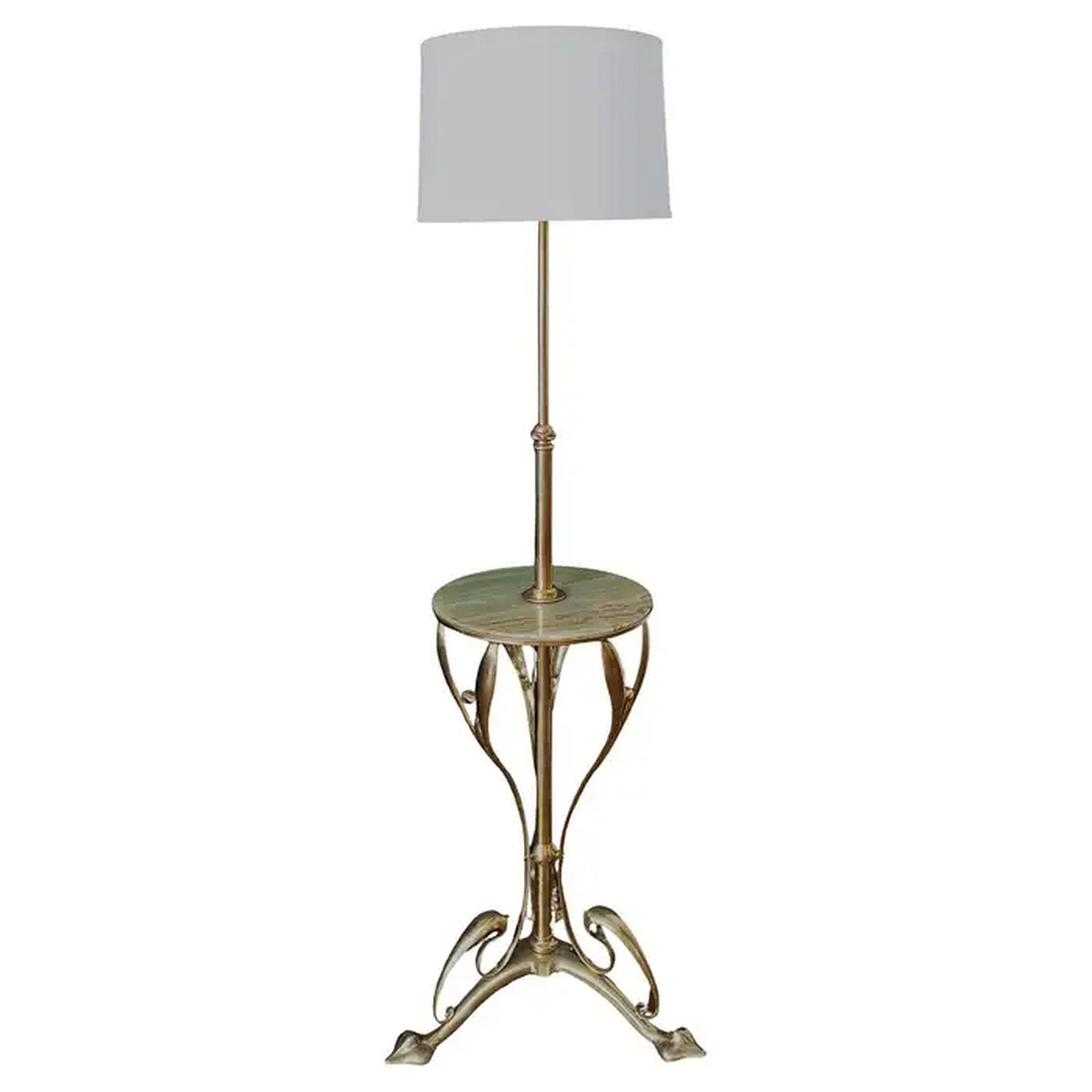 Art Nouveau Floor Lamp of Brass with Table Top of Green Onyx Marble from France