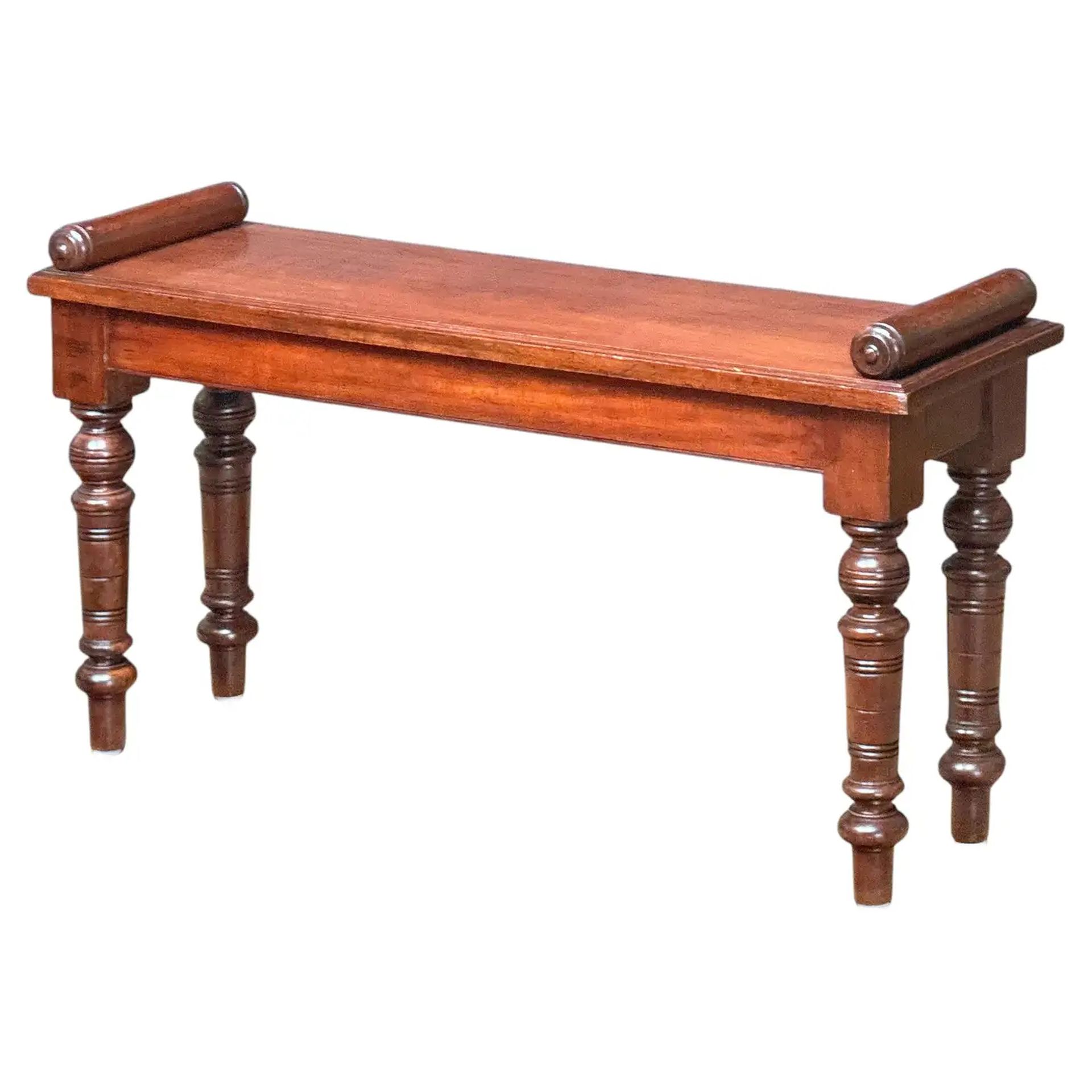 A fine English hall bench or window seat or stool of mahogany from the Edwardian era, featuring roll-end bolsters at opposing ends, over a moulded edge long plank seat of figured mahogany, and set upon four turned legs.