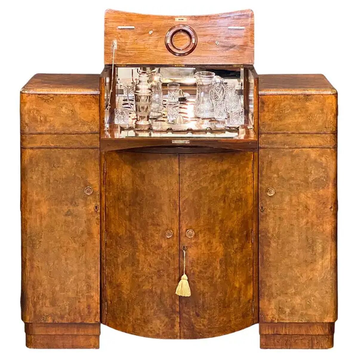 A fine English upright cocktail dry bar cabinet or drinks cupboard - from the Art Deco Period - featuring a handsome burr walnut veneer with a mirrored serving area for spirits.