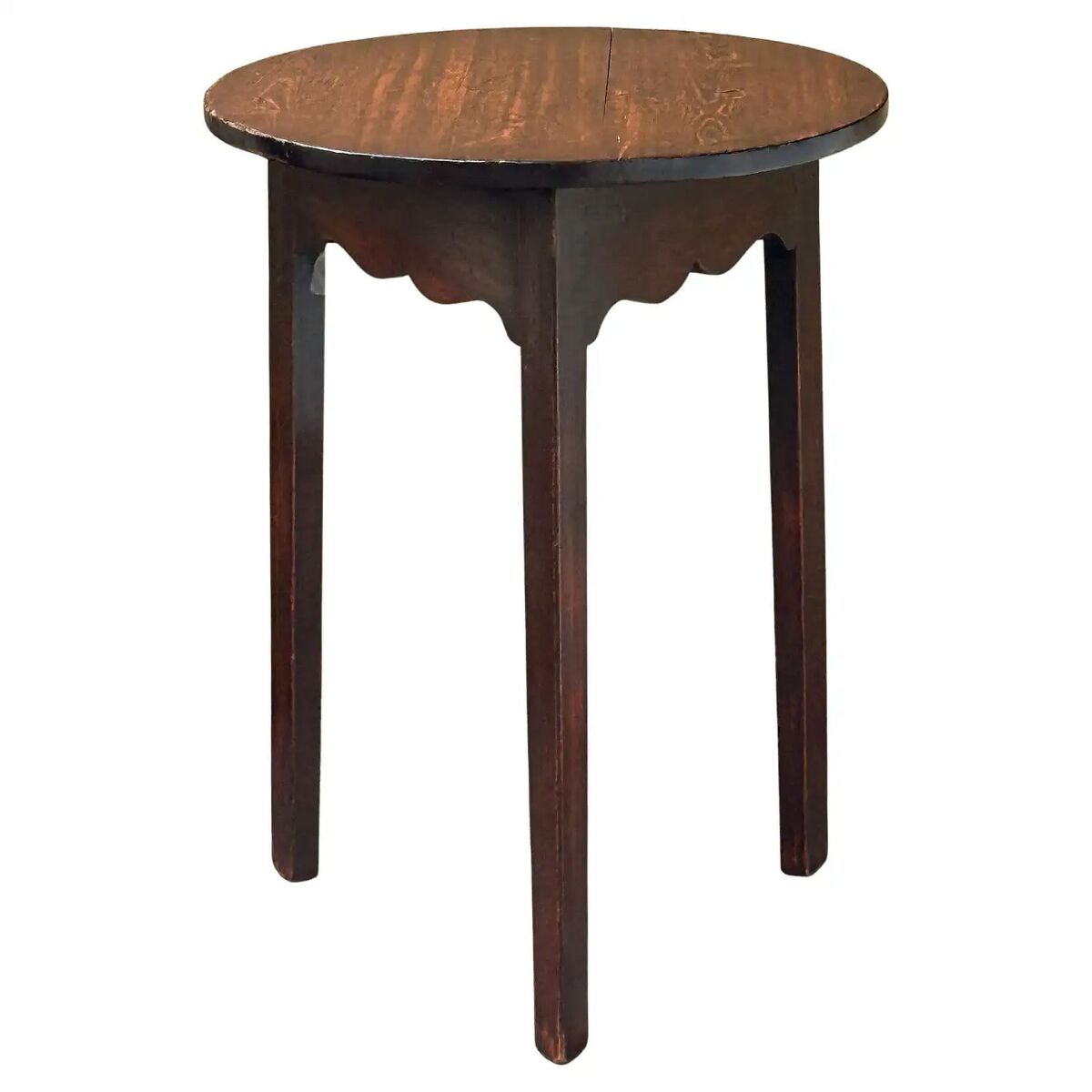 A handsome English cricket table of patinated oak from the late Georgian Era, c.1790, featuring the traditional round or circular top over a tripod base with a scalloped apron