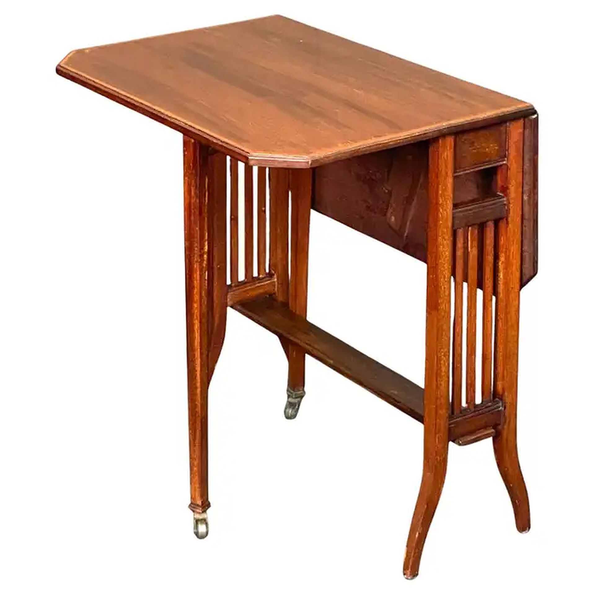A fine English drop-leaf Sutherland table of mahogany from the Edwardian era, attributed to Spillman & Co of London. With two drop leaves and gatelegs that open to make a great games or tea-time occasional table. Brass rolling casters on the gateleg extensions.