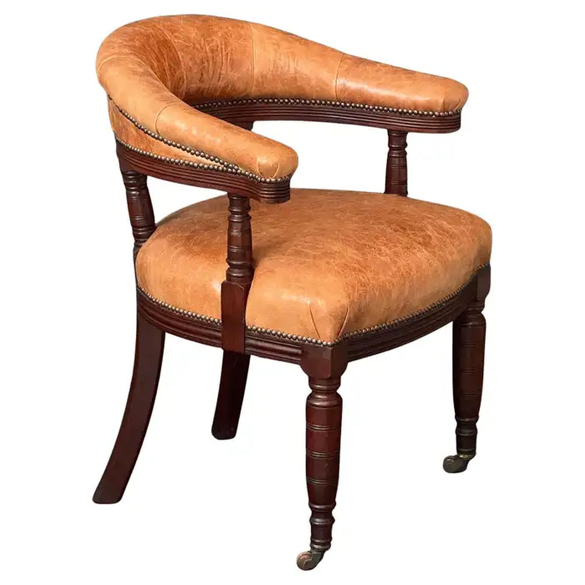 A fine library armchair or lounge chair of mahogany in the George III style from England, featuring a high upholstered leather back with wide comfortable upholstered leather seat and open sides, and shaped arms, on a stretcher with brass nail-head trim around the borders, resting on two turned front-facing legs with rolling porcelain caster wheels, and two swept back legs.