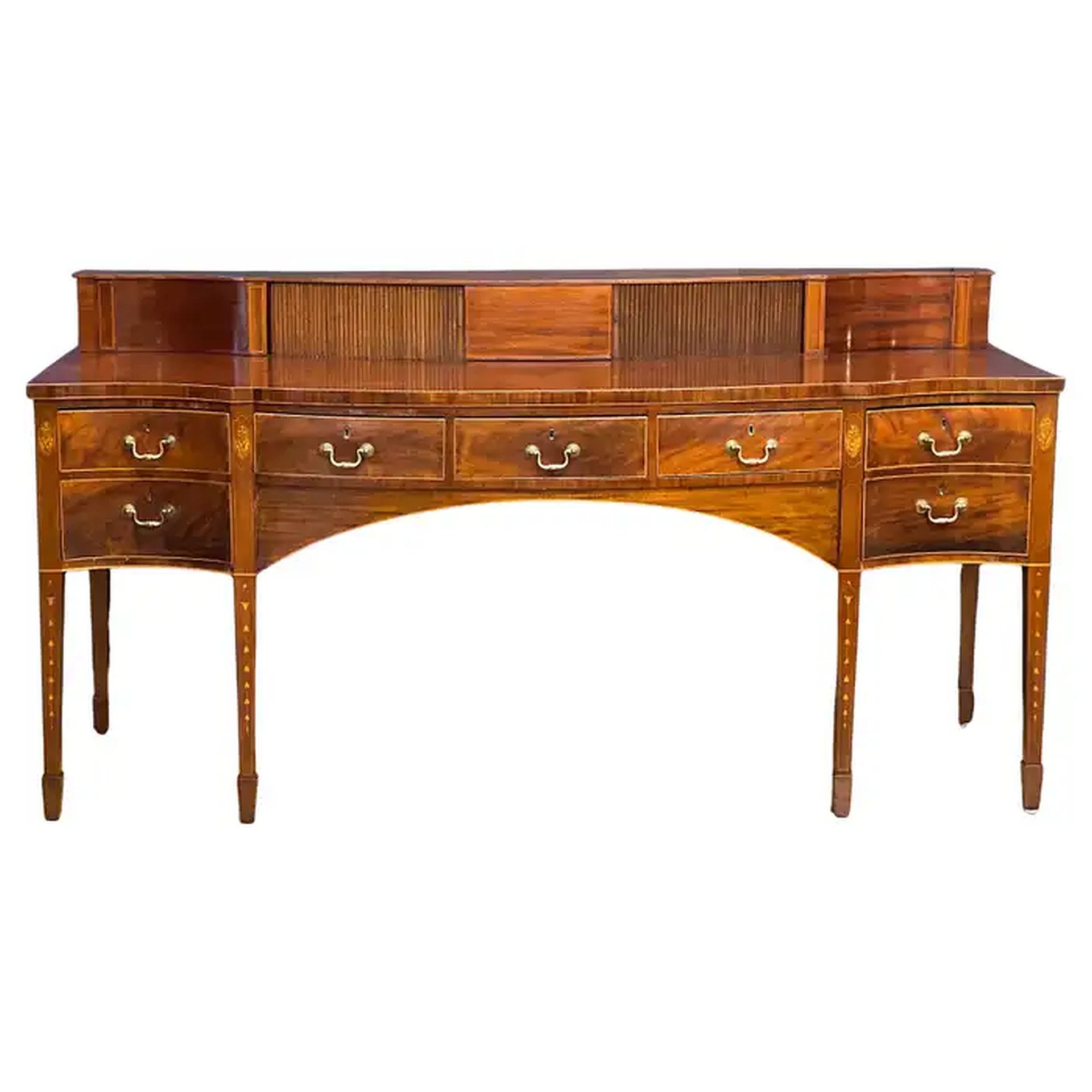 A handsome English sideboard server (or serving console) from the Georgian era - featuring a serpentine moulded top with raised gallery back - enclosing two compartments with tambour slides, over an inlaid mahogany frieze with opposing left-facing and right-facing cabinet drawers for wine storage - showing as faux double drawers, and three middle large drawers, all with brass pulls. The top and frieze with boxwood stringing and fine inlay with a foliate design. The whole set upon six tapering legs with spade feet.