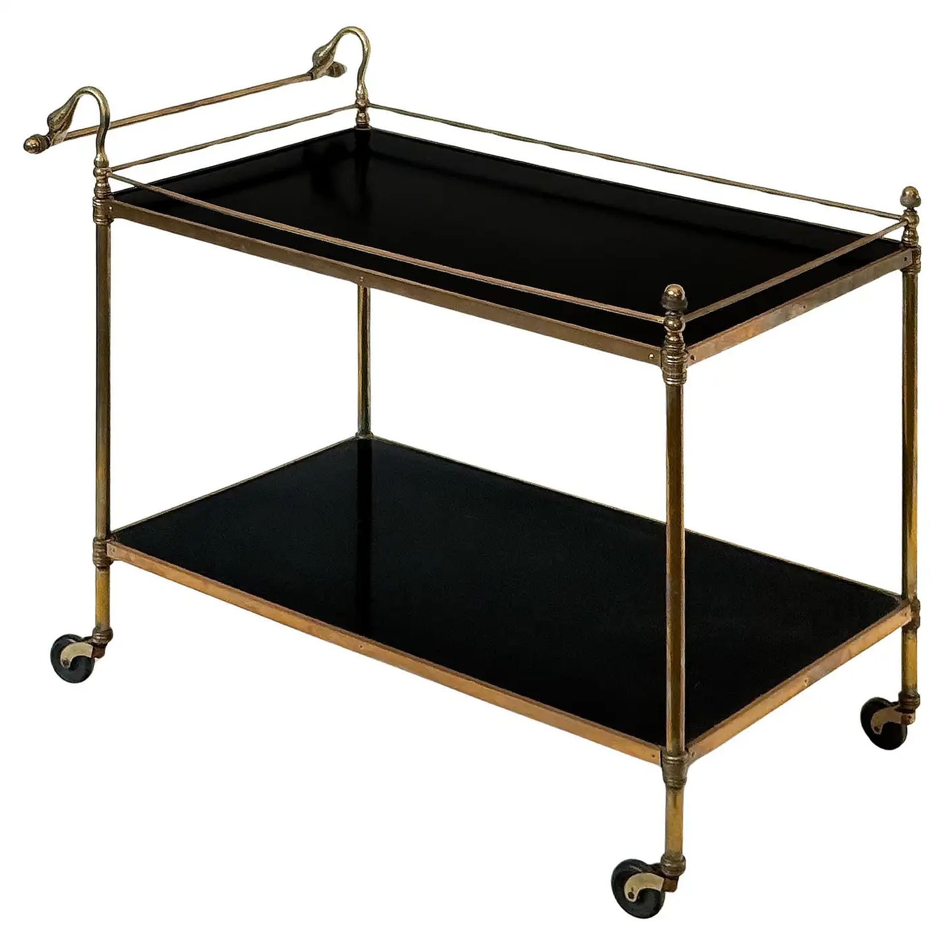 A handsome two-tiered drinks cart or serving trolley (bar cart) from England in the Neoclassical style, featuring a swan's neck design on the handle. The top tier with brass gallery railing and finials, each tier with black laminated wooden shelves, resting on rolling caster wheels.