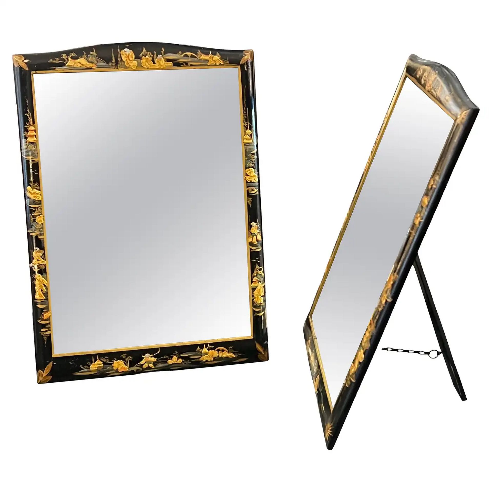A pair of elegant English vanity or table-top mirrors from the late 19th century - each mirror featuring a rectangular wooden ogee frame with a beautiful Chinoiserie design over black lacquer surrounding the mirrored glass.
