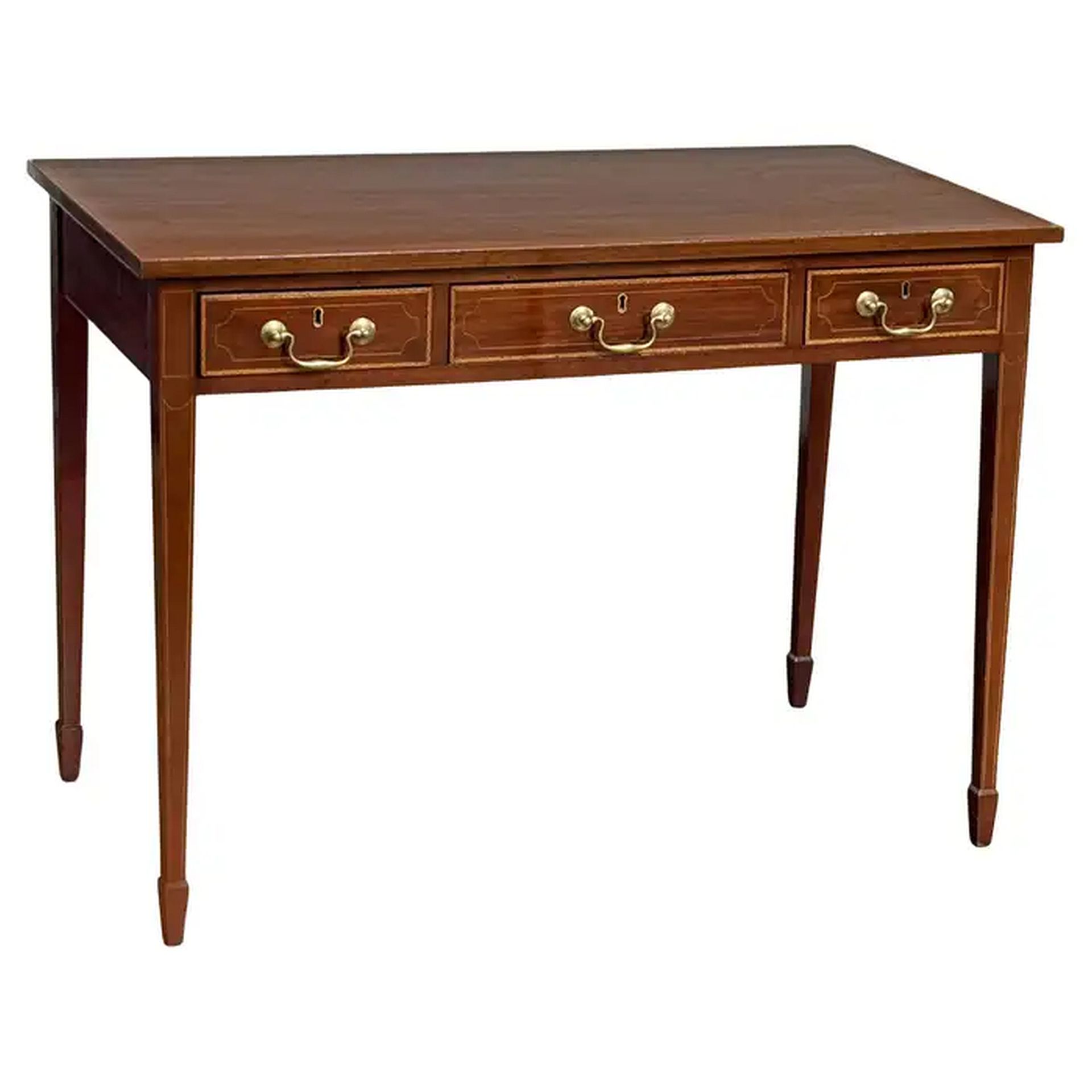 A fine English writing table or desk of mahogany from the Edwardian Era, featuring a rectangular top with inlay along the front edge, over a frieze of three drawers - each with brass swan neck handles, with decorative inlay to drawer facings and to front facing legs, set upon four tapering legs.