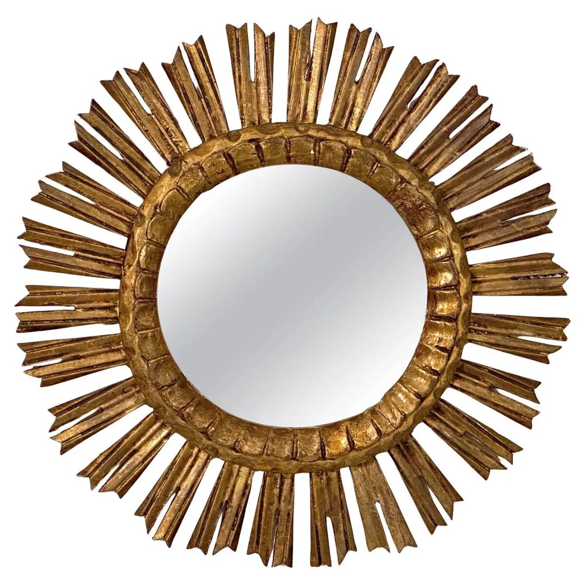 A beautiful French gilt sunburst (or starburst) mirror with gilded rays arranged around a mirror plate glass center.