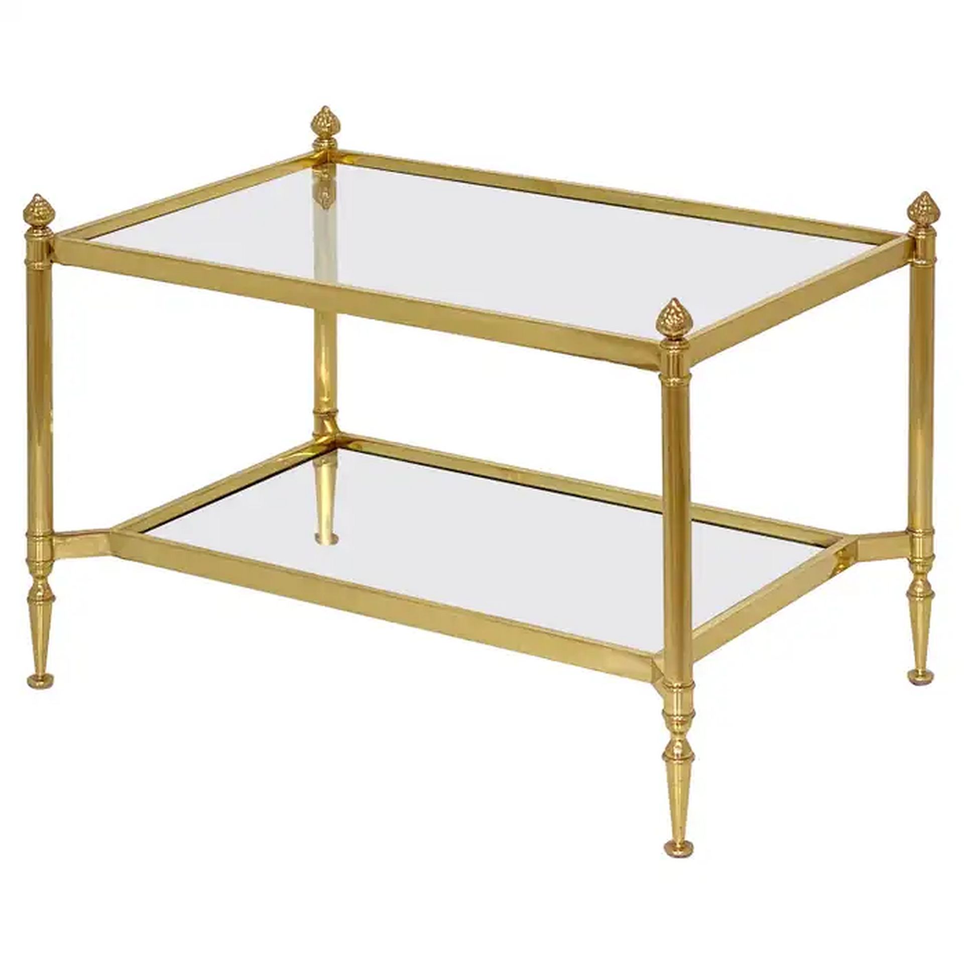 A fine set of two French Modern rectangular low end occasional or coffee or cocktail tables - each table featuring a rectangular brass frame with two tiers of inset glass, with decorative acorn finials at each corner and elegantly reeded legs.