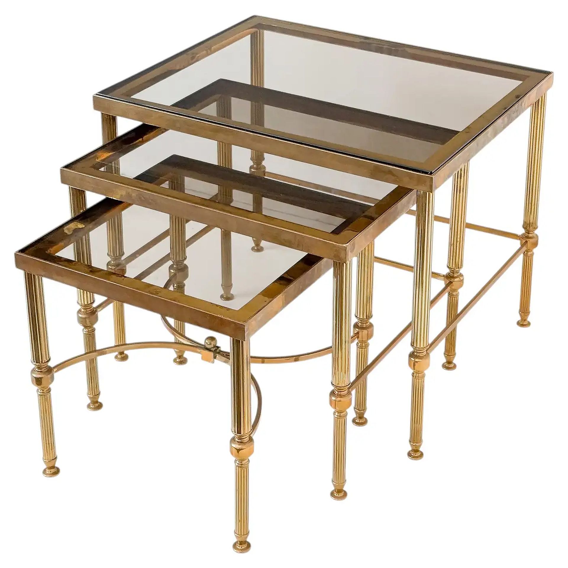 A set of French Modern rectangular nesting low tables featuring three fitted tables, each with an elegant frame design in gilt metal with inset rectangular smoked glass top.