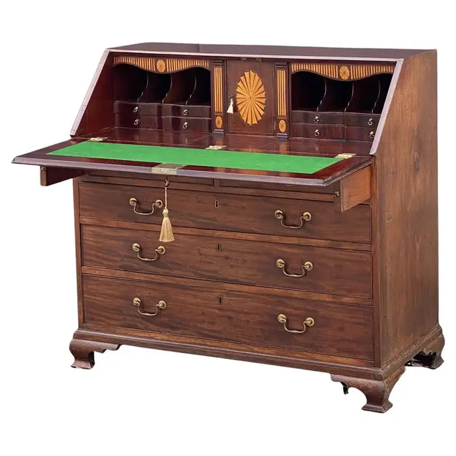 A fine George III slant top desk or bureau secretary chest of patinated mahogany, c.1770, in the Sheraton style.