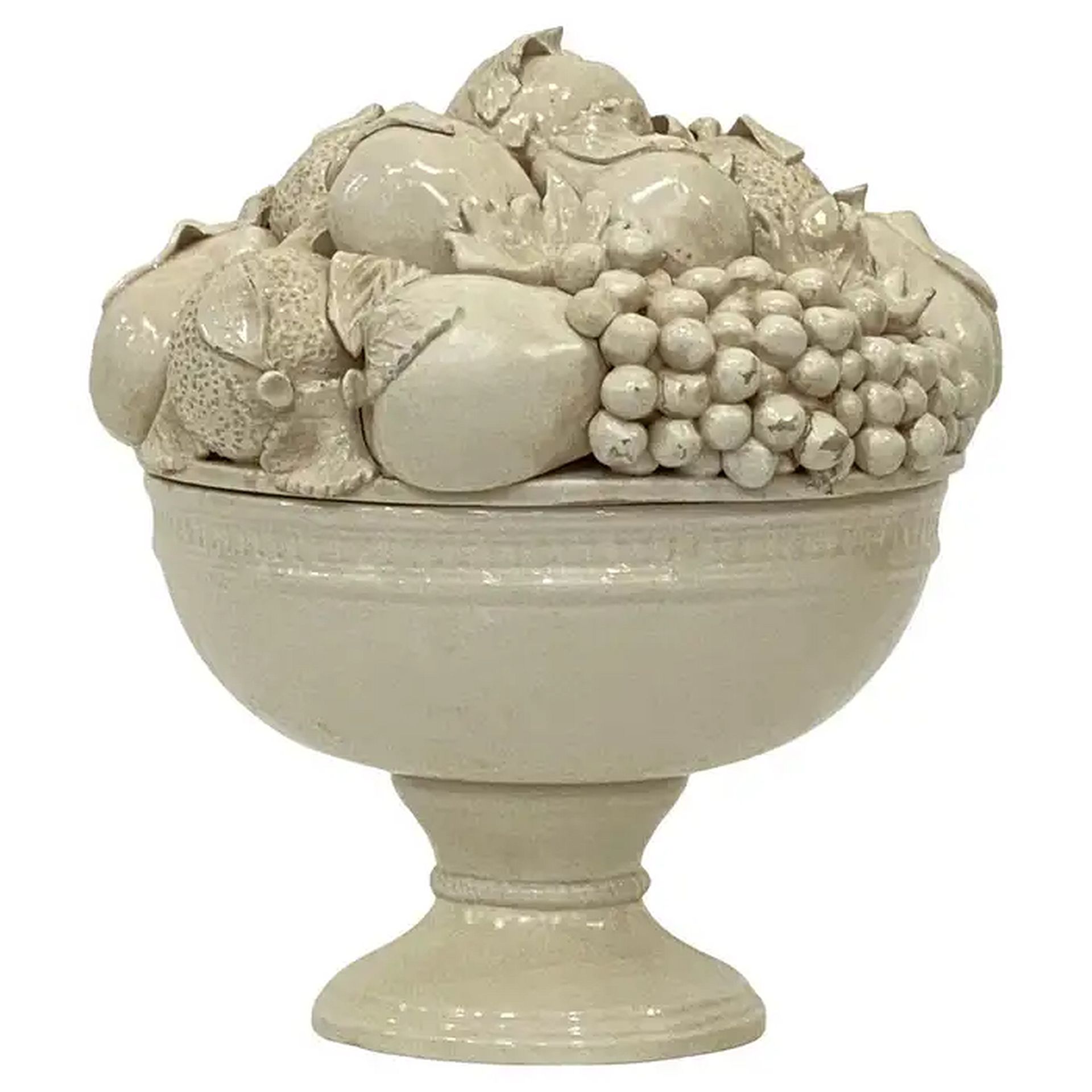 A fine large Italian cream-ware or white glazed ceramic pedestal bowl with mixed fruit topiary top, featuring a fitted lid with a relief of mixed fruits around the circumference, over a lower body with bowl and pedestal support on a round plinth base.