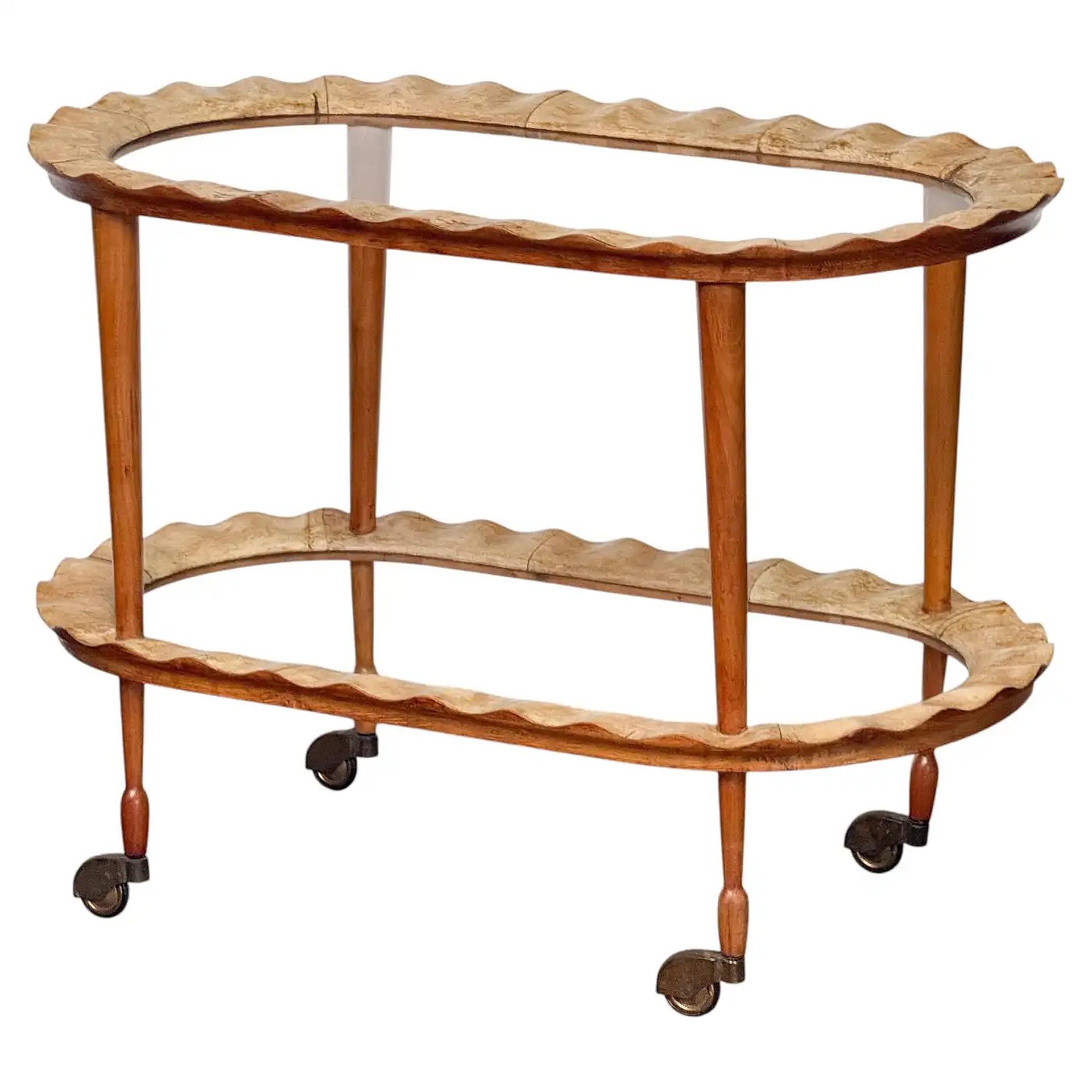 A fine two-tier Italian drinks cart or bar trolley of scalloped wood with tiers of glass from the Hollywood Regency period, Set upon rolling casters.