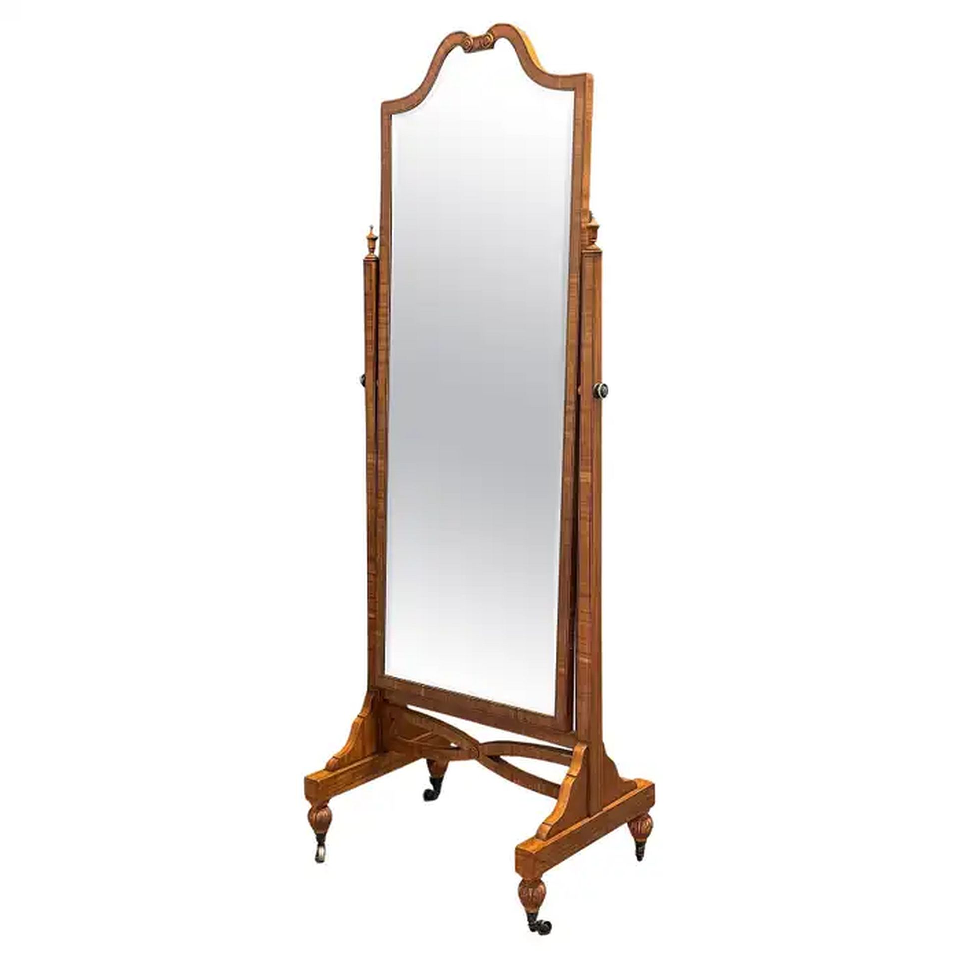A fine large English cheval or full-length dressing mirror from the Edwardian era, featuring a mirrored glass panel framed in satinwood with inlaid stringing around the circumference, mounted to a stretcher frame of turned wood, capped with turned finials, on rolling casters.